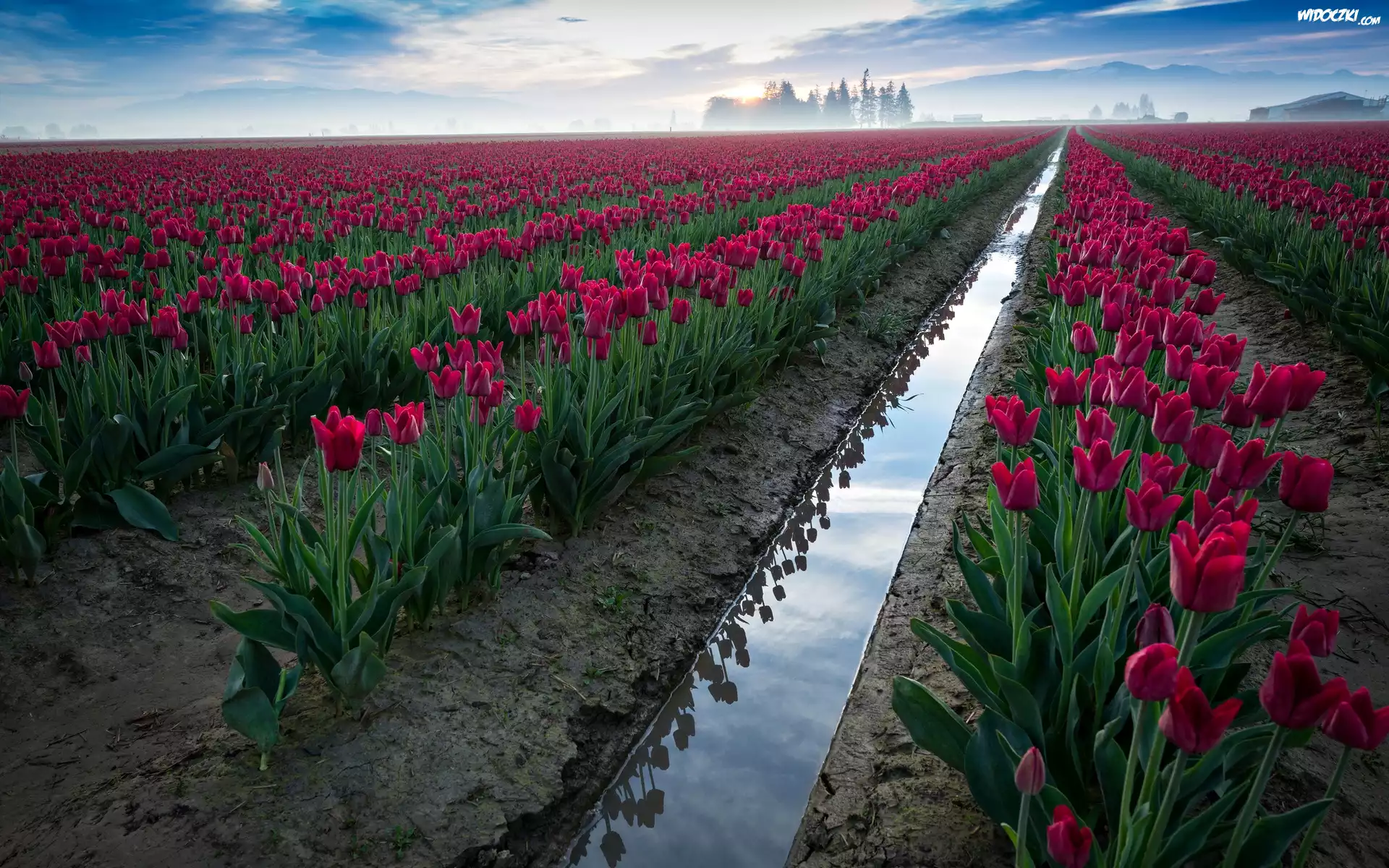 Zdjęcia, Czerwone, Tulipany, Pole, Uprawa