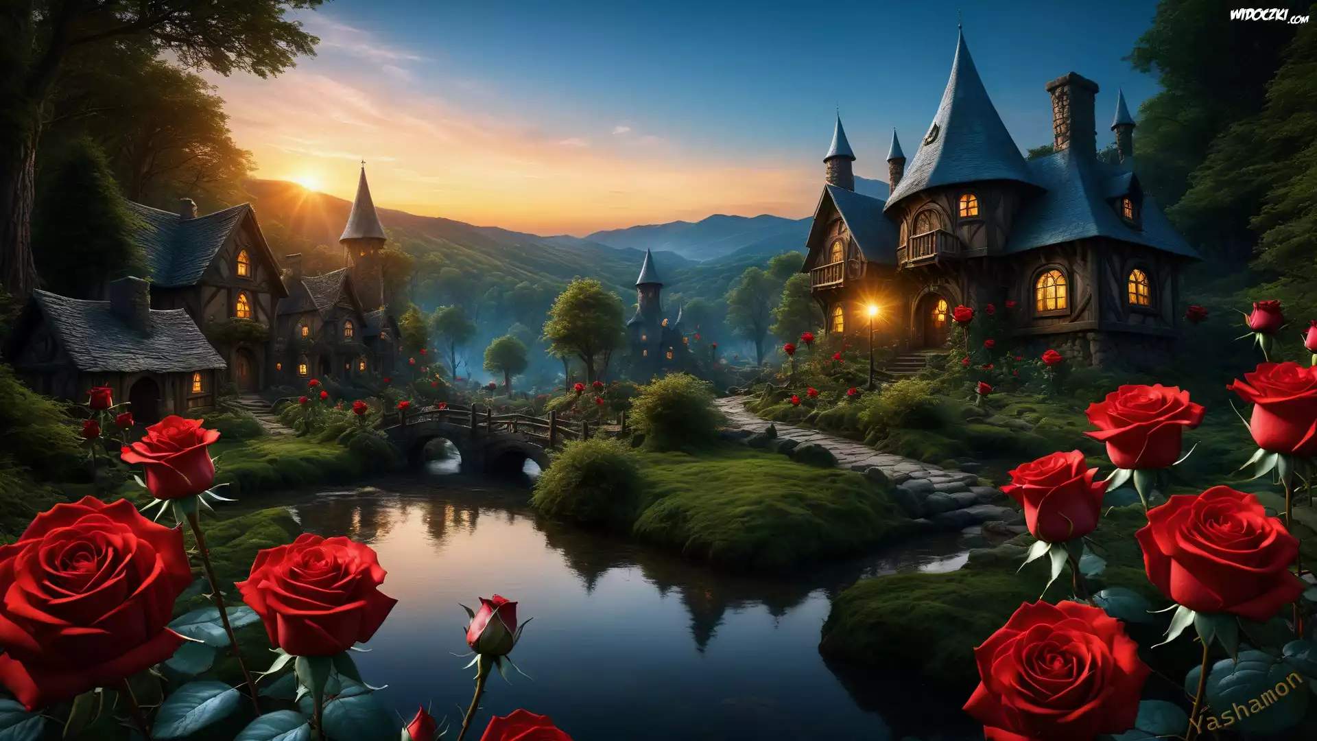 Zdjęcia, Góry, Las, Drzewa, Domy, Rzeka, Mostek, Czerwone, Róże, Zachód słońca, Grafika