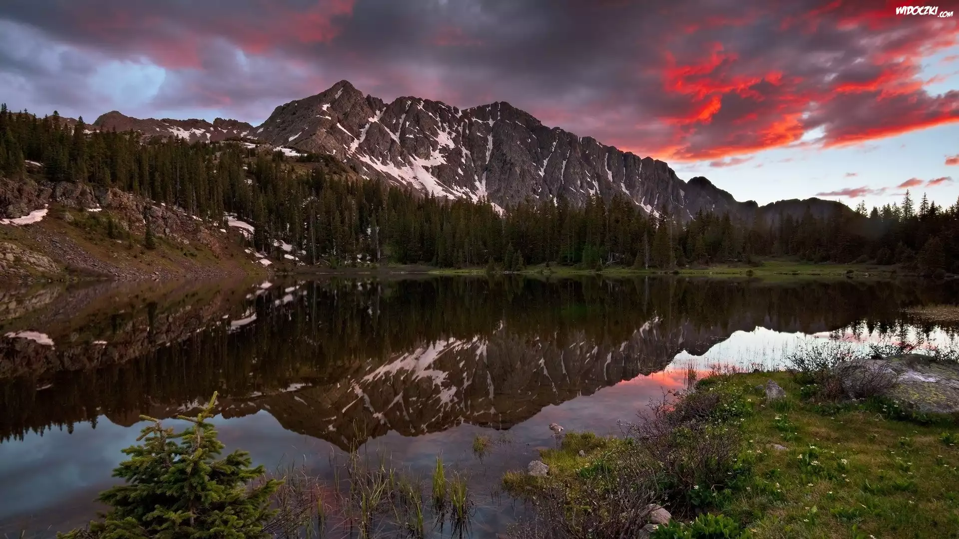 Zdjęcia, Czerwone, Chmury, Góry, Rzeka, Łąka
