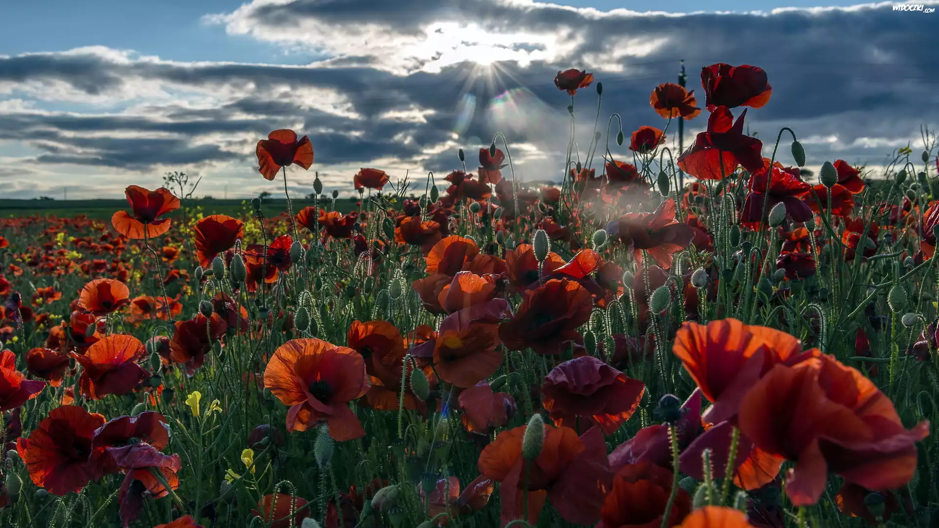 Czerwone, Maki, Promienie, Słońca, Chmury