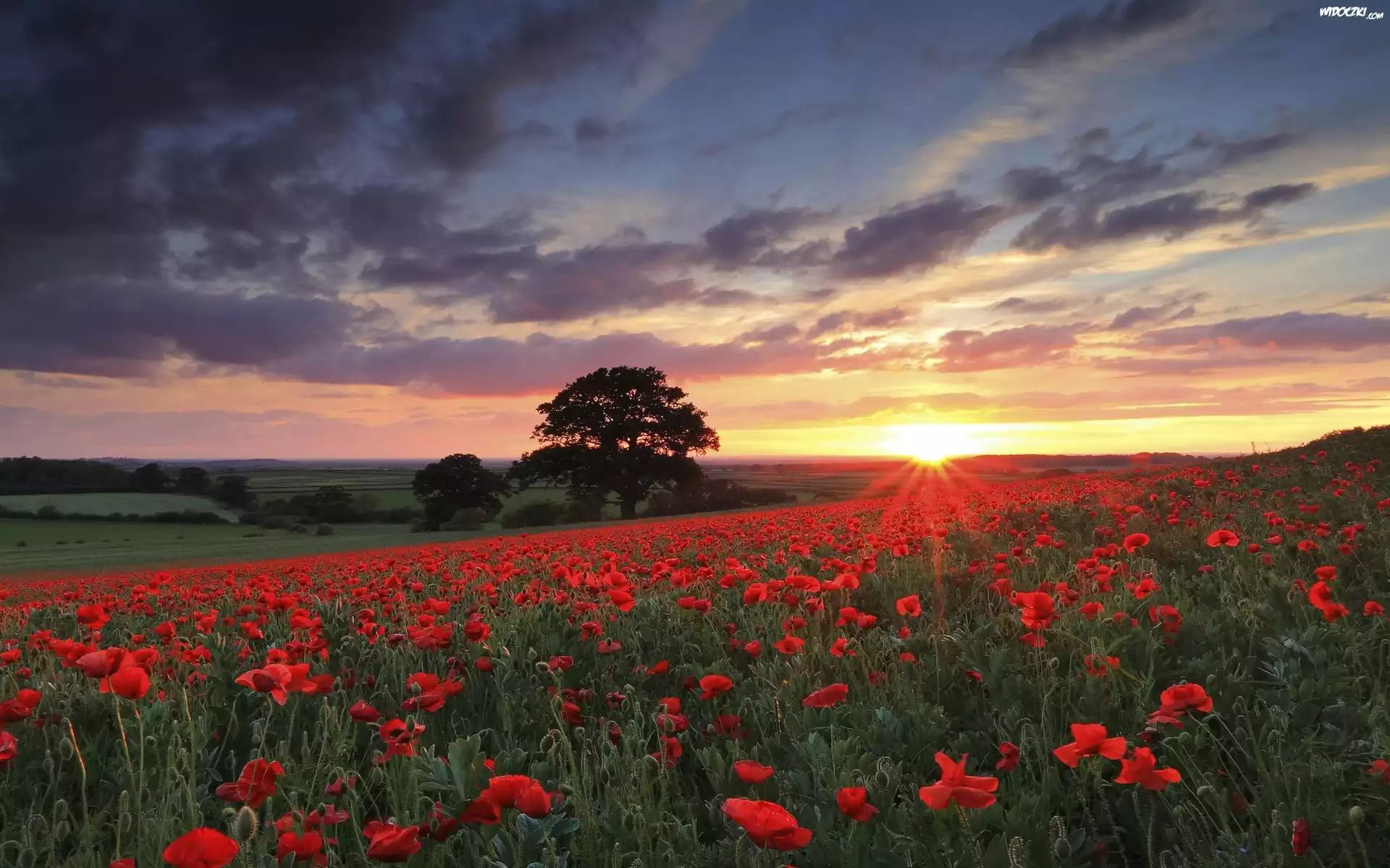 Czerwone, Maki, Łąka, Zachód, Słońca