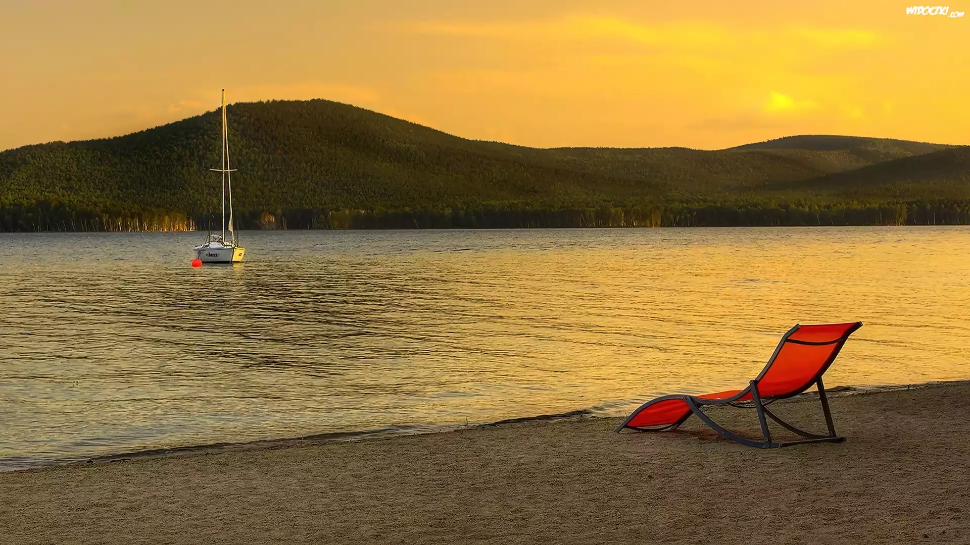 Zdjęcia, Czerwony, Leżak, Jezioro, Plaża, Żaglówka, Wakacje