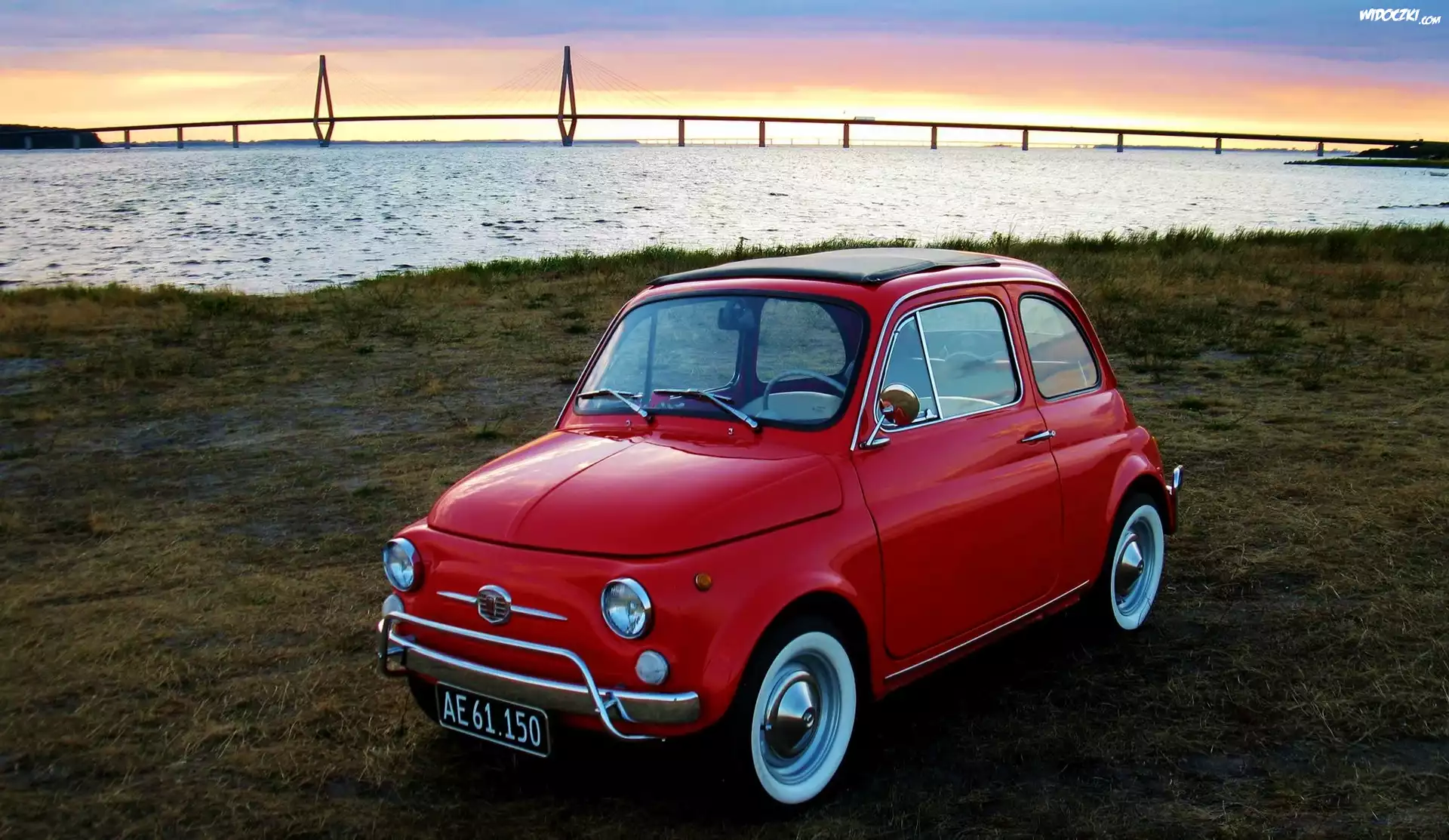 Czerwony, Fiat 500, Rzeka, Most