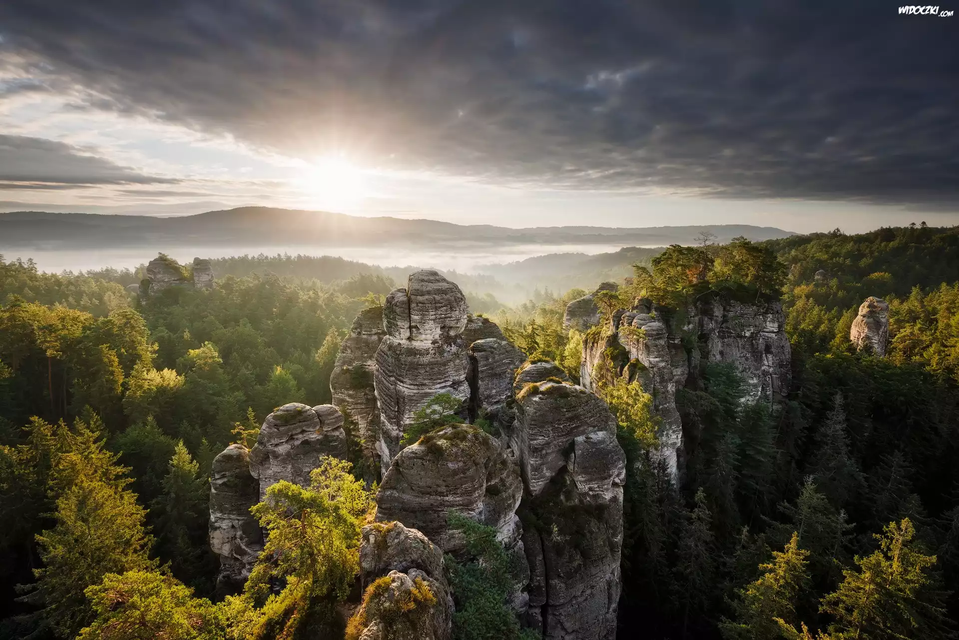 Zdjęcia, Wschód Słońca, Chmury, Góry Stołowe, Mgła, Skały, Las, Drzewa, Czeski Raj, Czechy