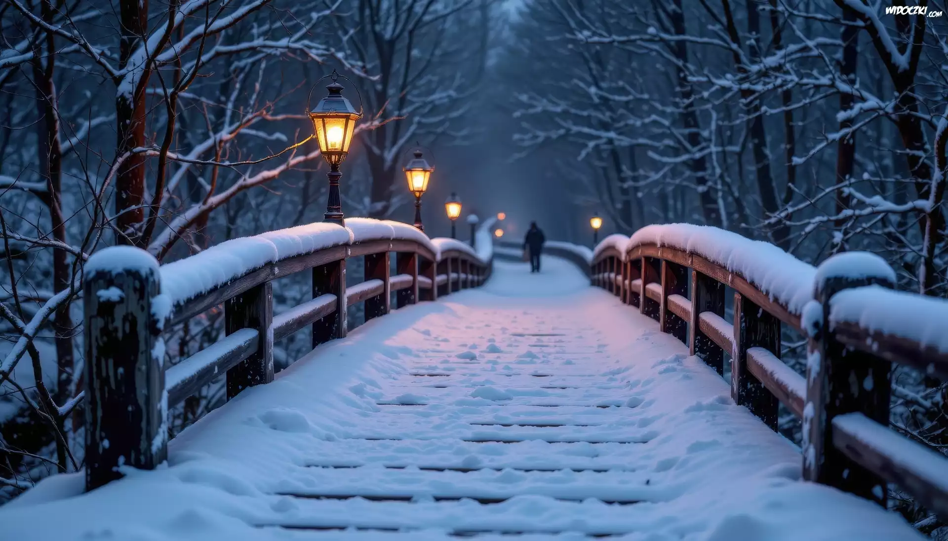Zdjęcia, Zima, Most, Latarnie, Człowiek, Park, Drzewa