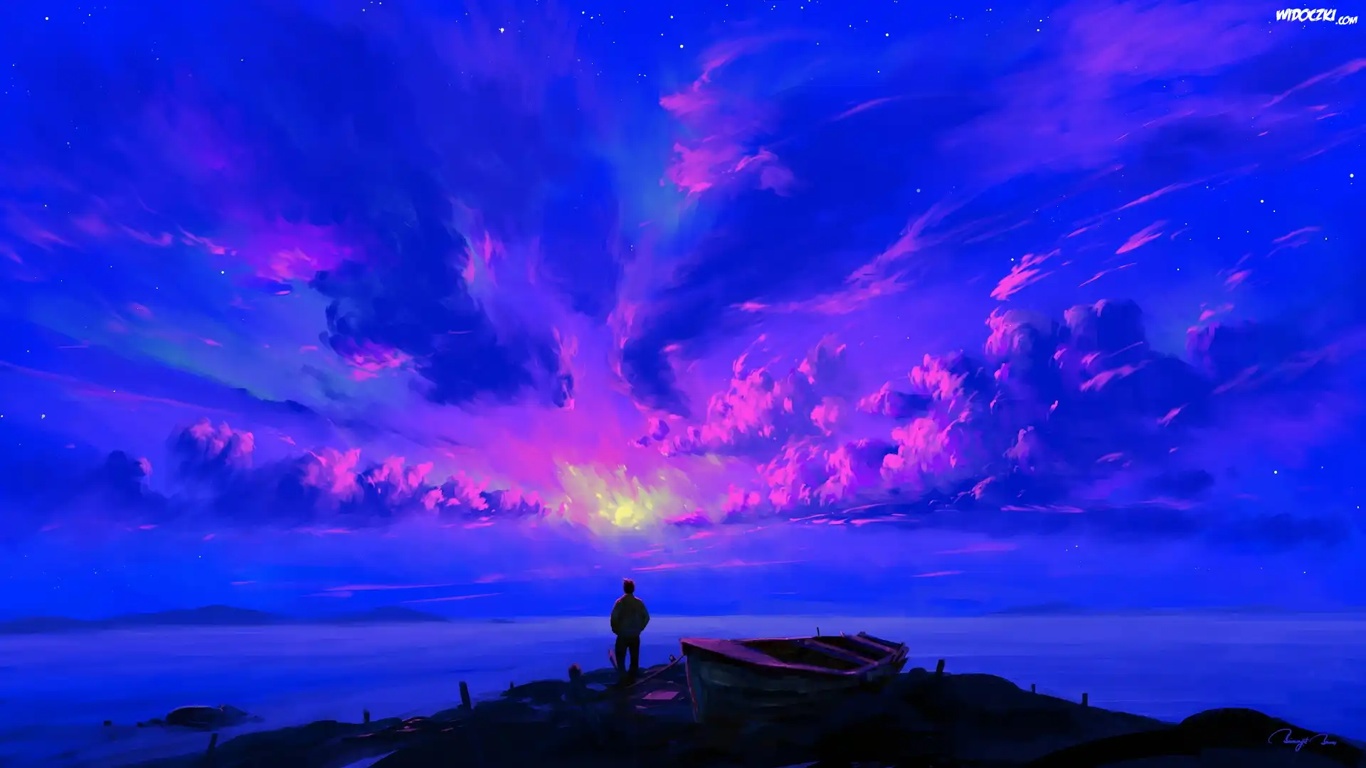 Grafika, Człowiek, Łódka, Jezioro, Chmury, Zachód słońca Paintography