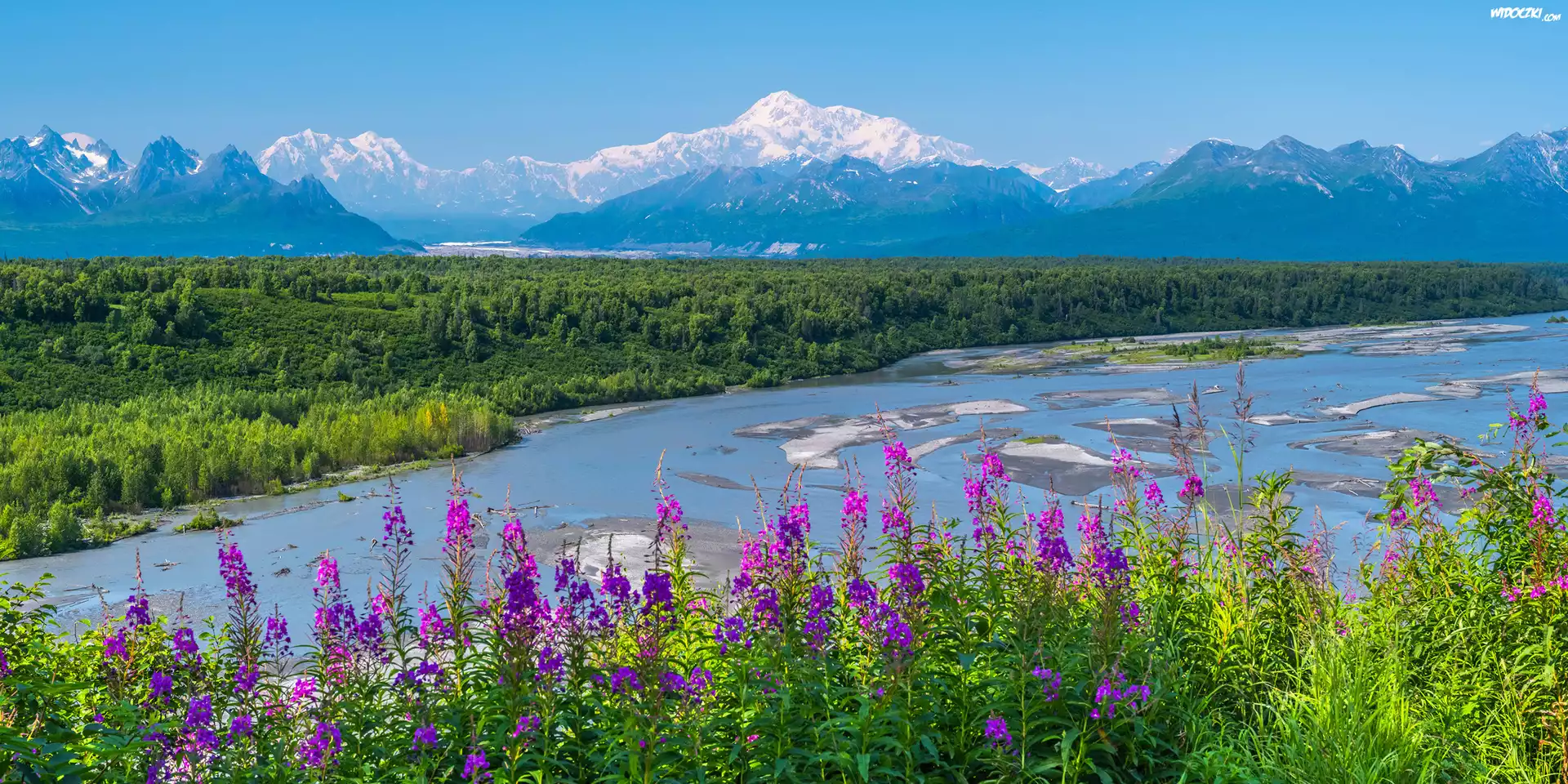 Zdjęcia, Stany Zjednoczone, Stan Alaska, Park Narodowy Denali, Góry, Kwiaty, Rzeka, Śnieg