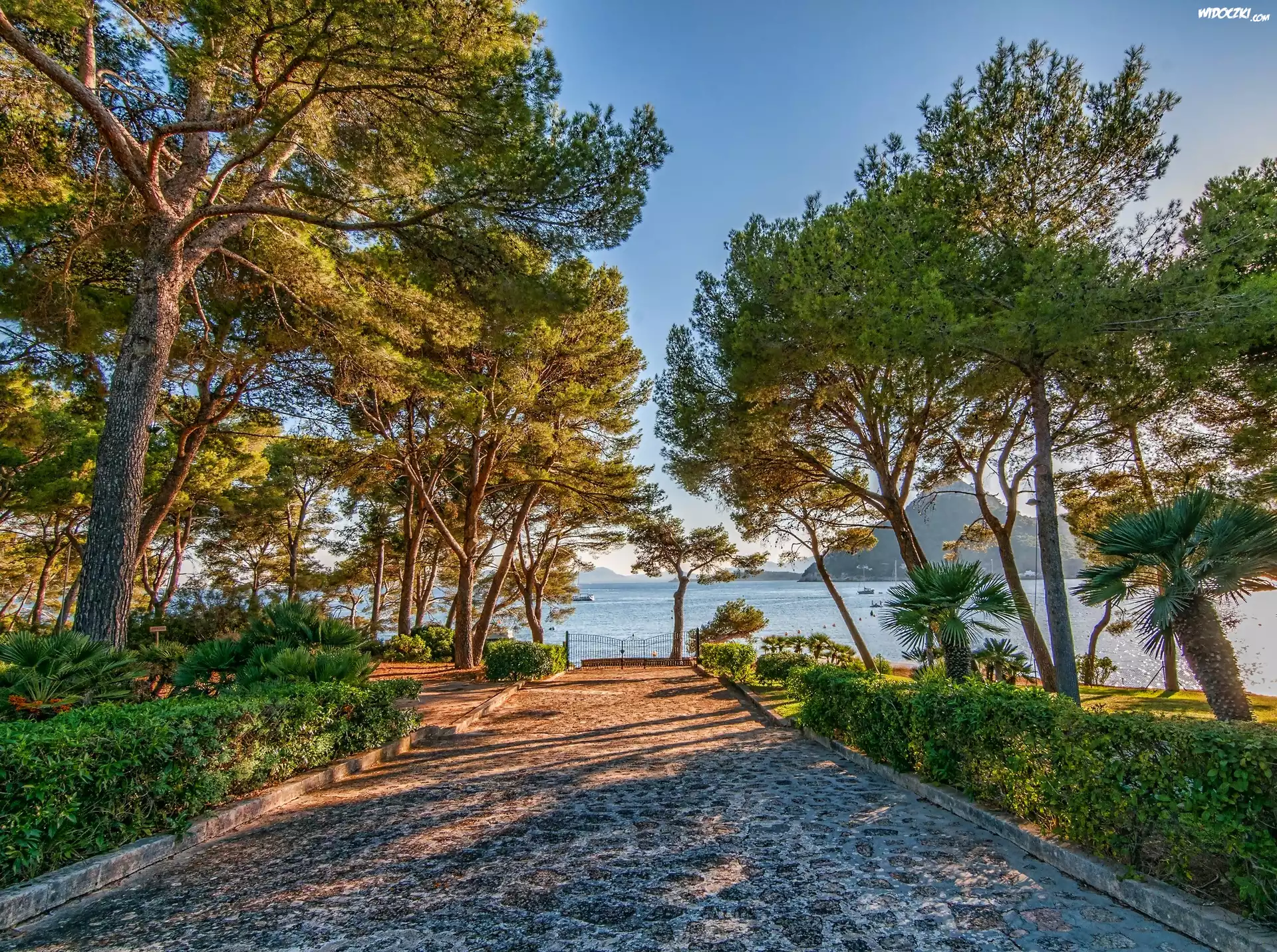 Zdjęcia, Deptak, Drzewa, Palmy, Morze