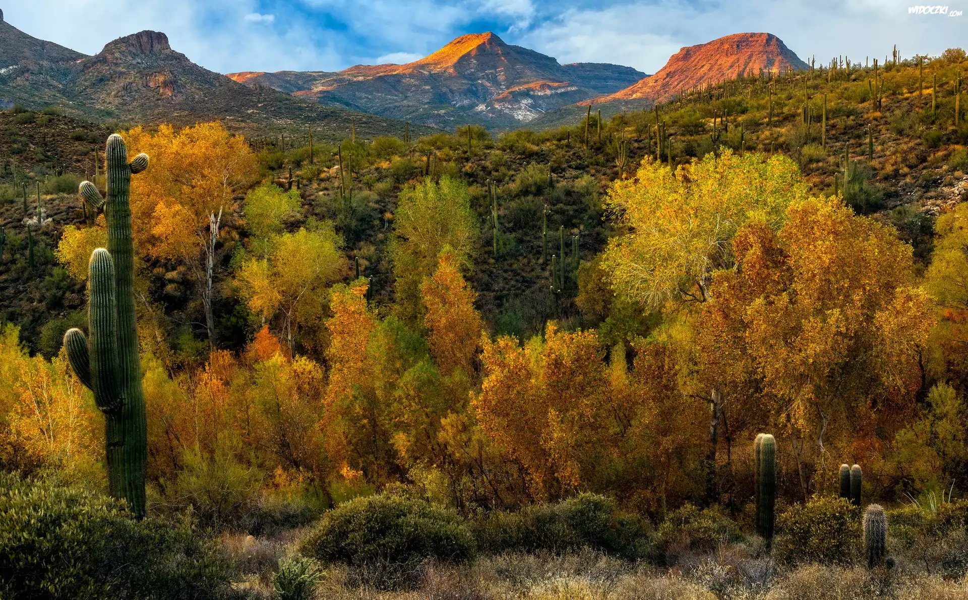 Zdjęcia, Stany Zjednoczone, Arizona, Pustynia Sonora, Sonoran Desert, Góry, Drzewa, Kaktusy, Jesień
