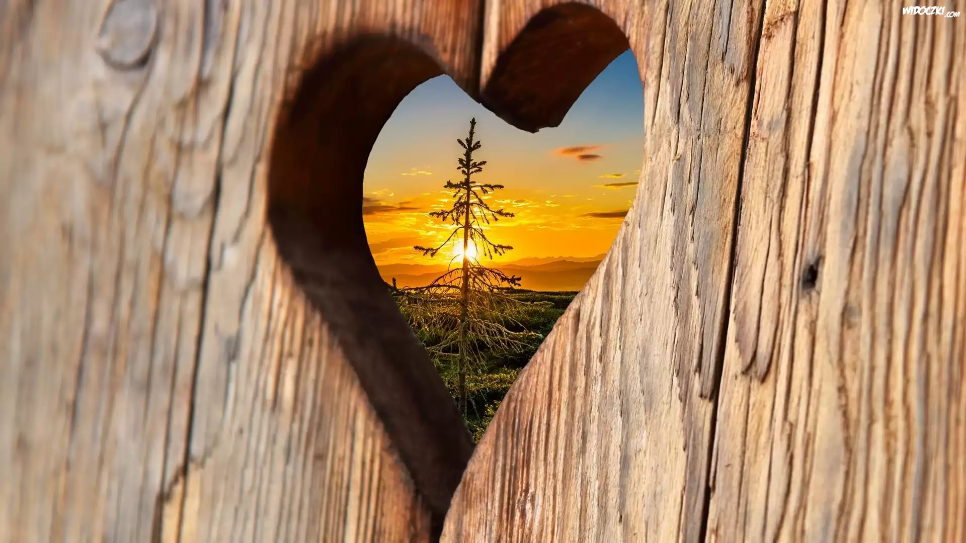 Zdjęcia, Drewno, Deski, Wycięte, Serce, Drzewo, Zachód słońca