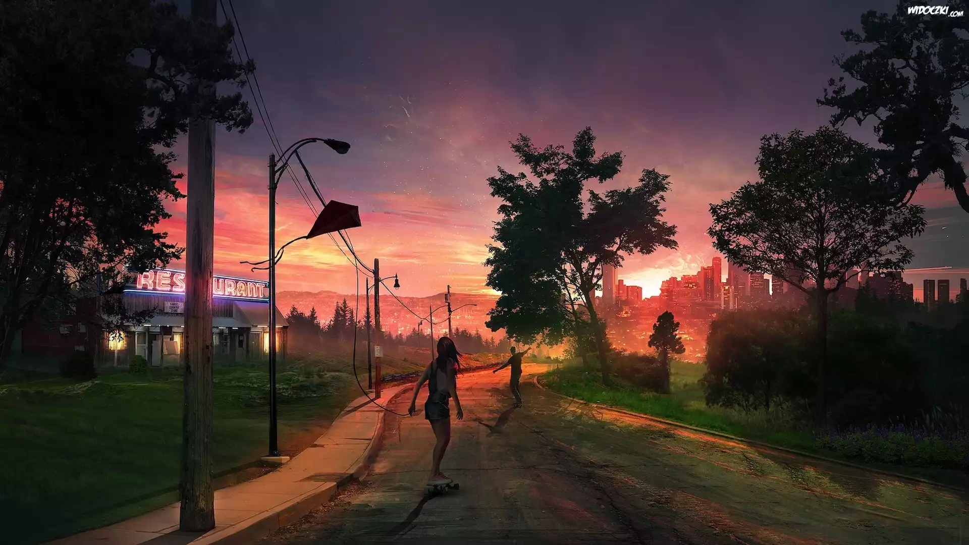 Zdjęcia, Grafika, Ulica, Drzewa, Droga, Domy, Zachód słońca, Chłopak, Dziewczyna, Deskorolki