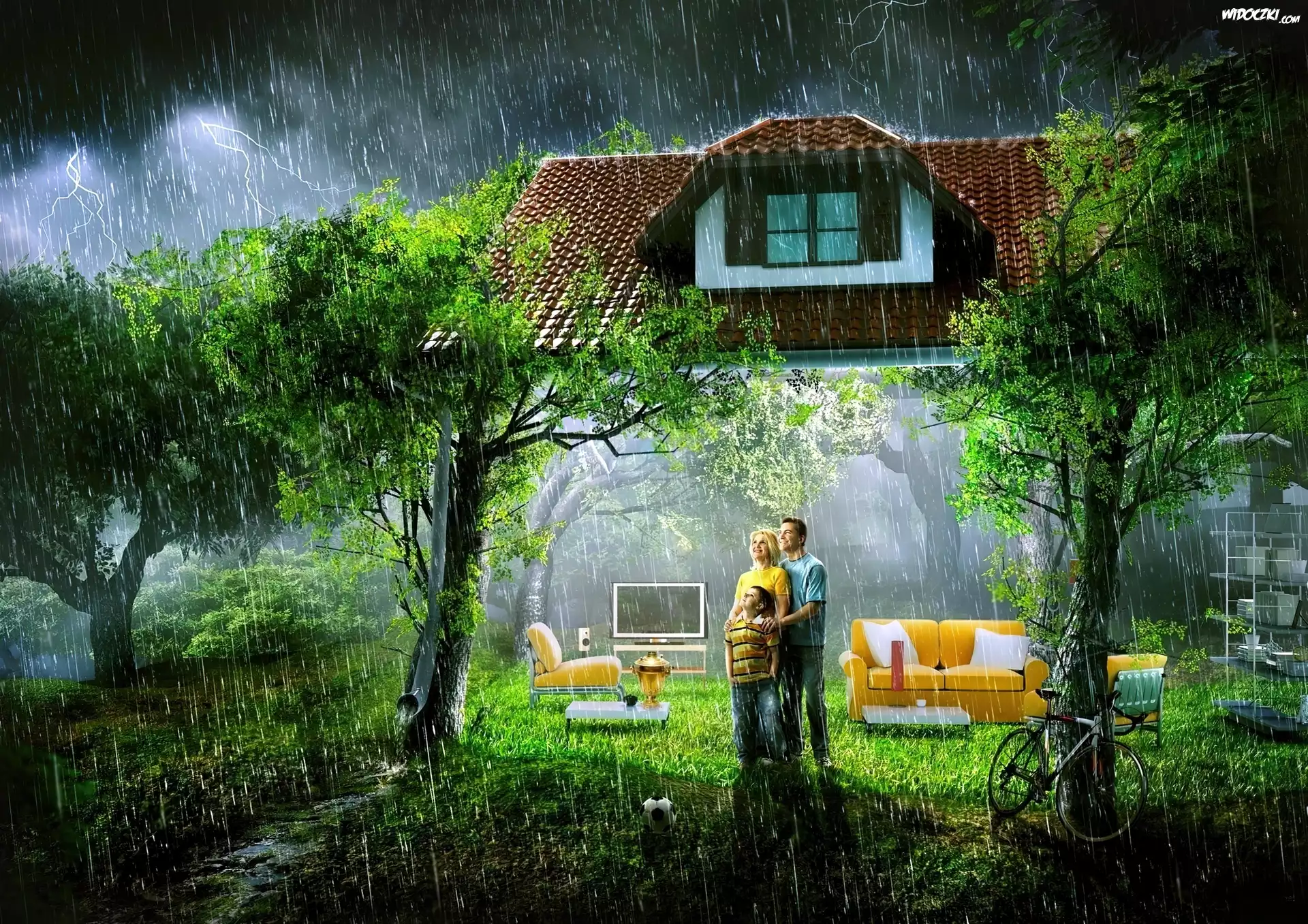 Zdjęcia, Dom, Deszcz, Rodzina