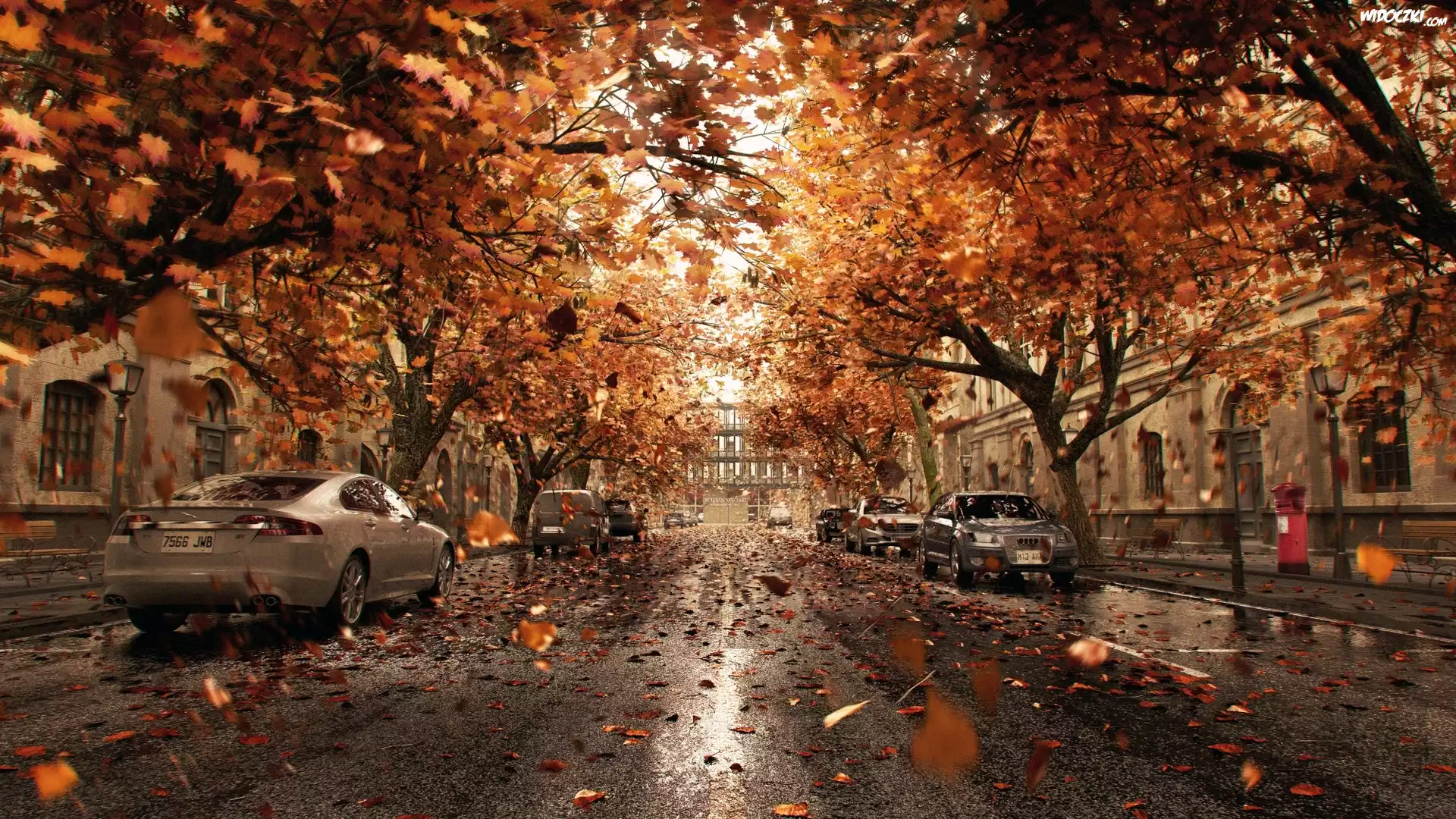 Jesień, Deszcz, Droga, Ulica, Samochody, Drzewa, Liście