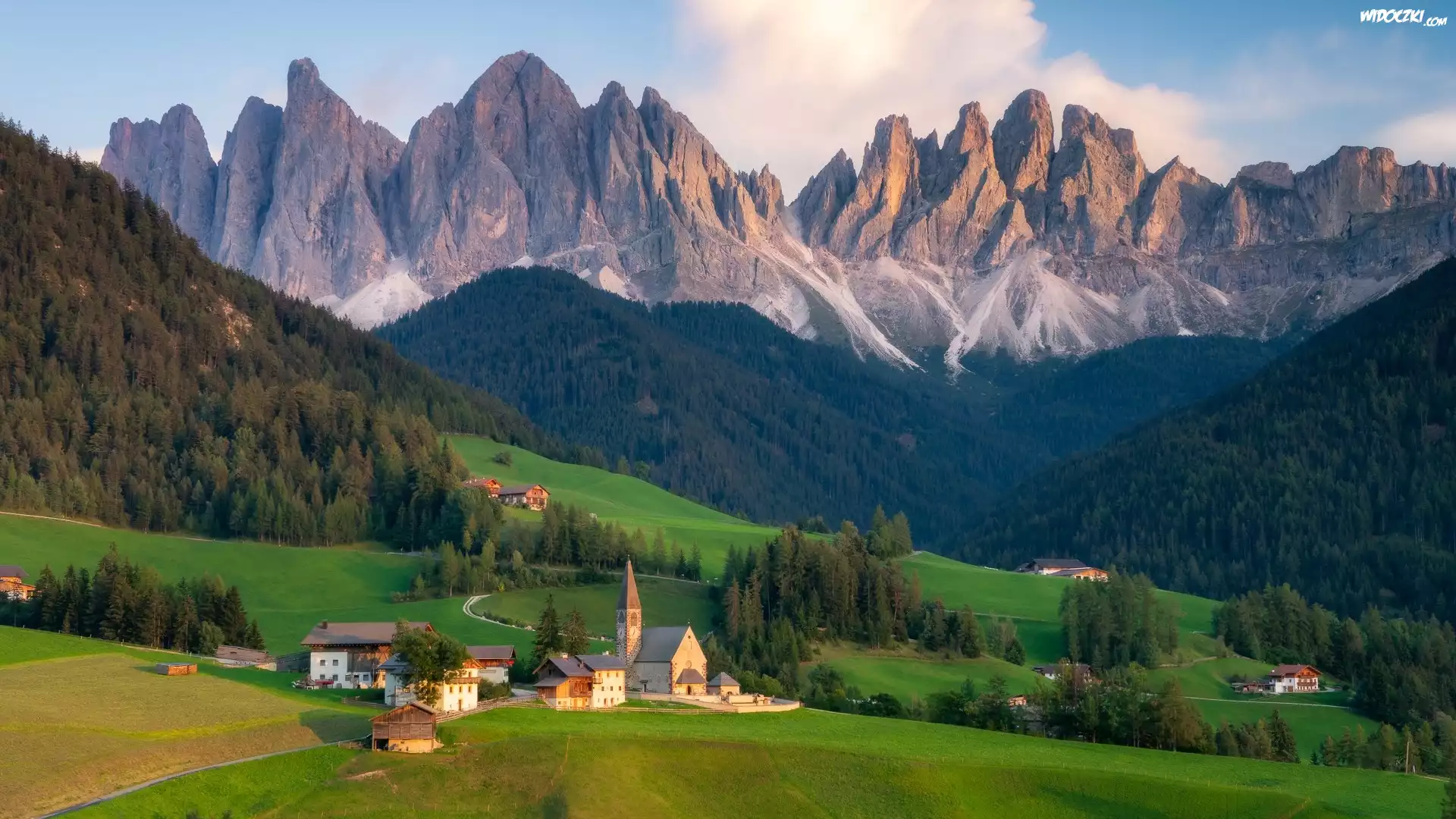 Zdjęcia, Góry, Dolomity, Dolina, Val di Funes, Drzewa, Lasy, Domy, Chmury, Wieś, Santa Maddalena, Włochy