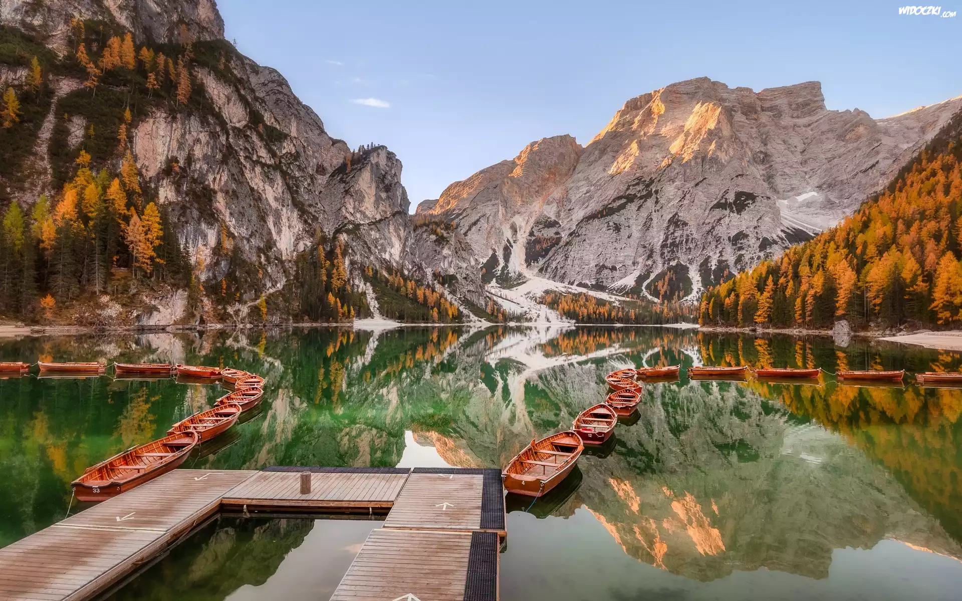Włochy, Południowy Tyrol, Jezioro, Pragser Wildsee, Lago di Braies, Góry, Dolomity, Łódki, Drzewa, Jesień, Odbicie |
