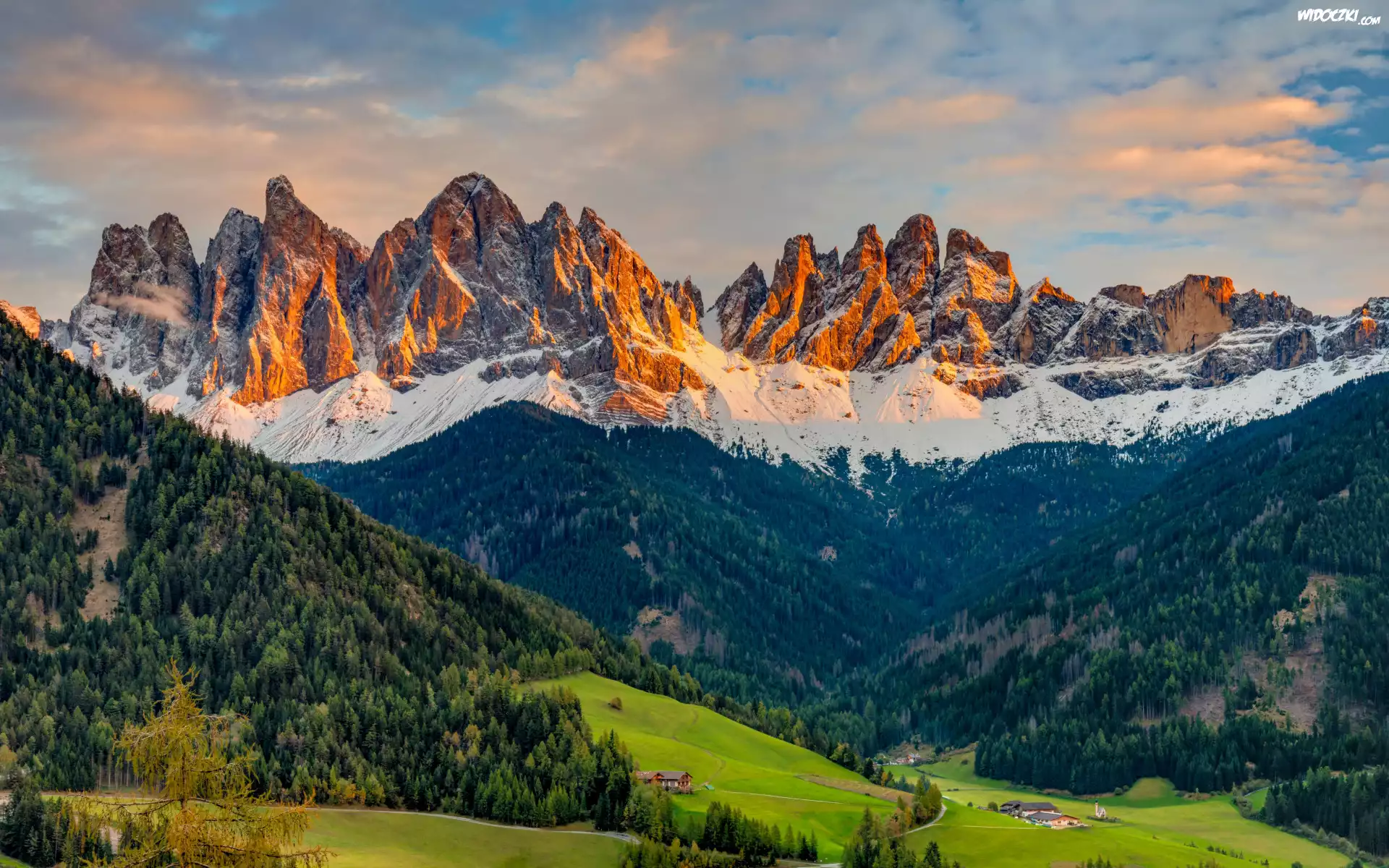 Zdjęcia, Góry, Alpy, Dolomity, Wieś, Santa Maddalena, Dolina, Val di Funes, Lasy, Domy, Chmury, Włochy