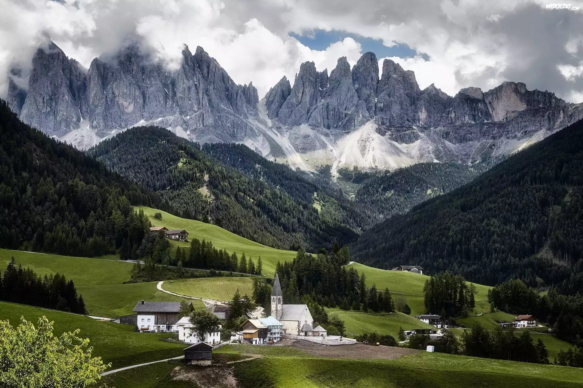 Zdjęcia, Dolina Val di Funes, Wieś Santa Maddalena, Włochy, Kościół, Góry, Dolomity