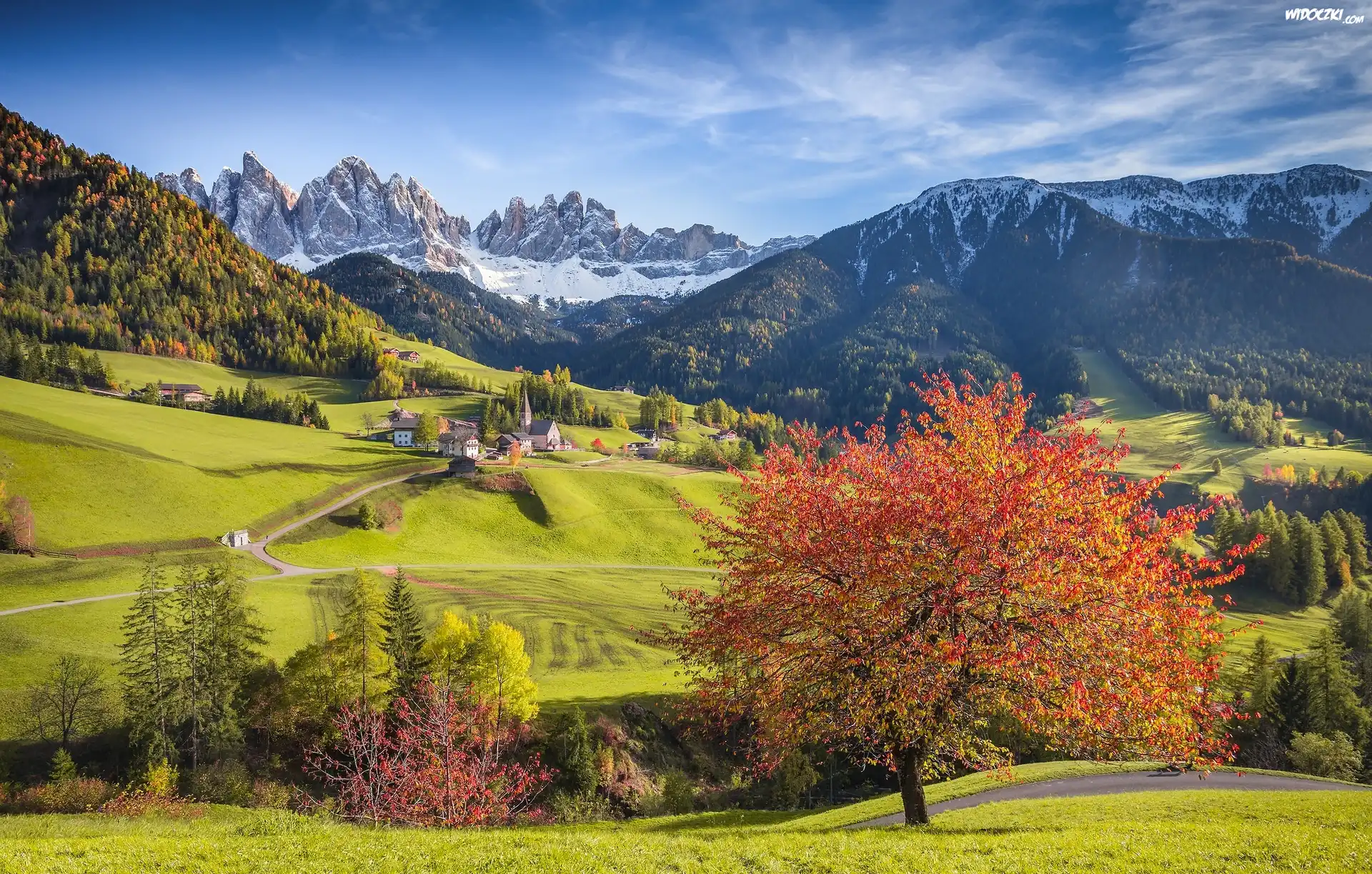 Zdjęcia, Włochy, Santa Maddalena, Dolina Val di Funes, Góry Dolomity, Wzgórza, Drzewa, Domy
