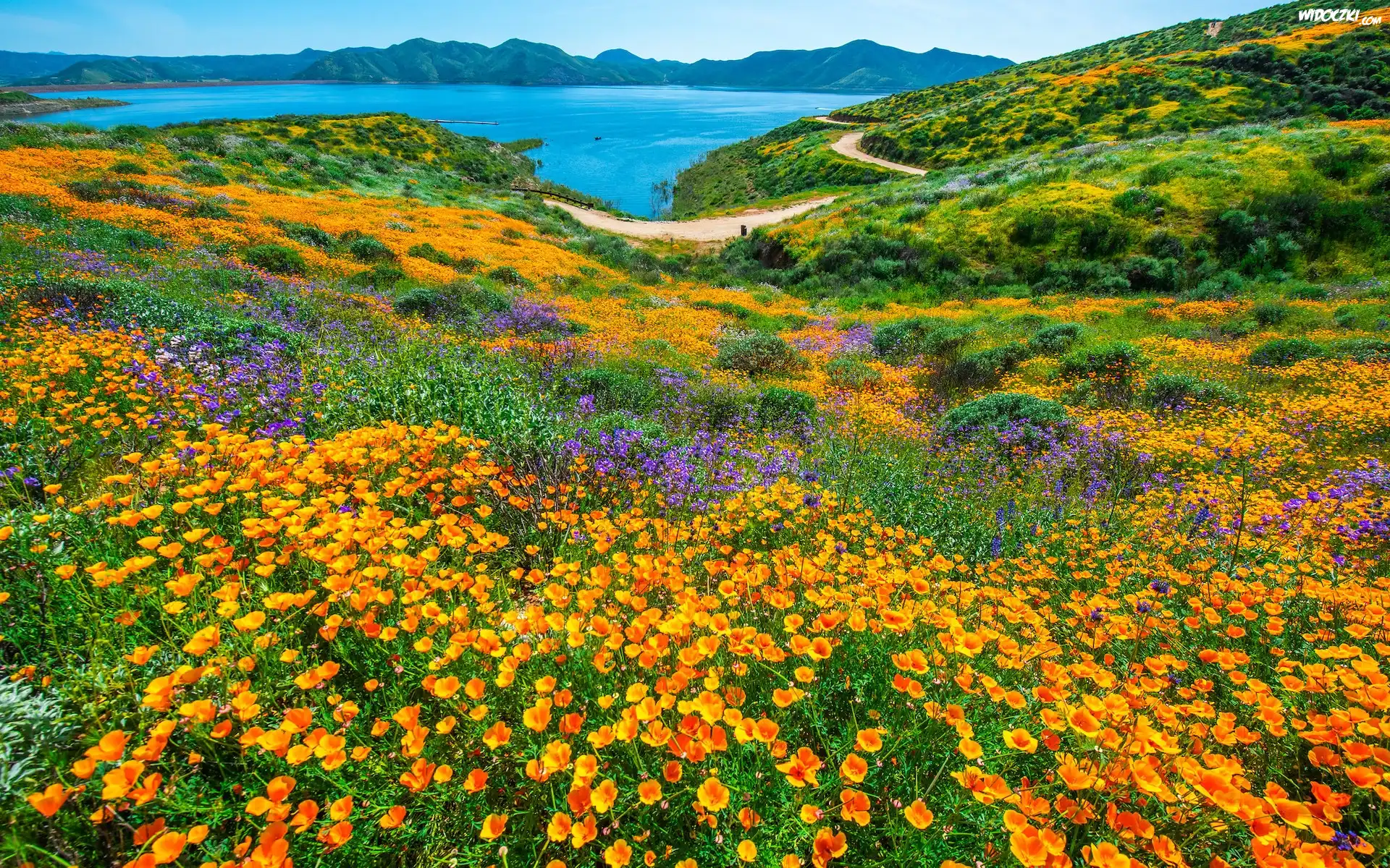 Stany Zjednoczone, Kalifornia, Jezioro, Diamond Valley Lake, Dolina Diamond Valley, Łąka, Kwiaty, Pozłotki, Wiosna |