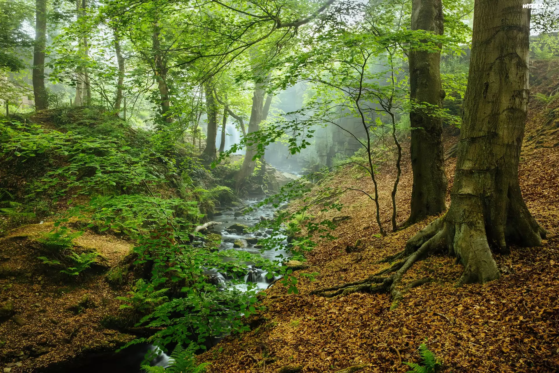 Anglia, Hrabstwo Derbyshire, Park Narodowy Peak District, Las, Drzewa, Strumyk, Mgła