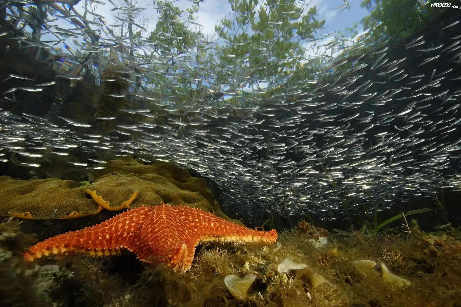 Zdjęcia, Dno, Morskie, Rozgwiazda, Ławica, Ryb, Wodorosty