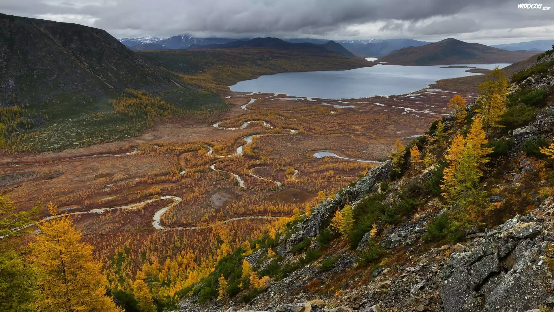 Zdjęcia, Góry, Dolina, Jezioro, Rzeki, Skały, Drzewa, Chmury