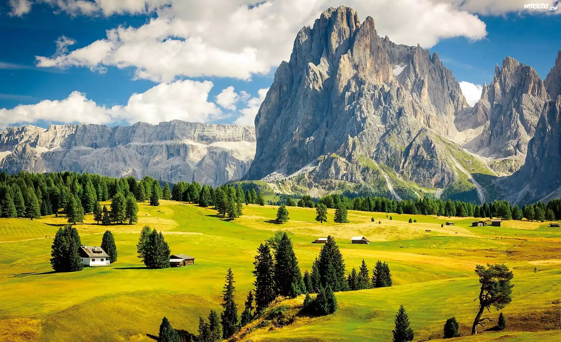 Góry, Dolina, Lasy, Pola, Domy, Drzewa, Obłoki