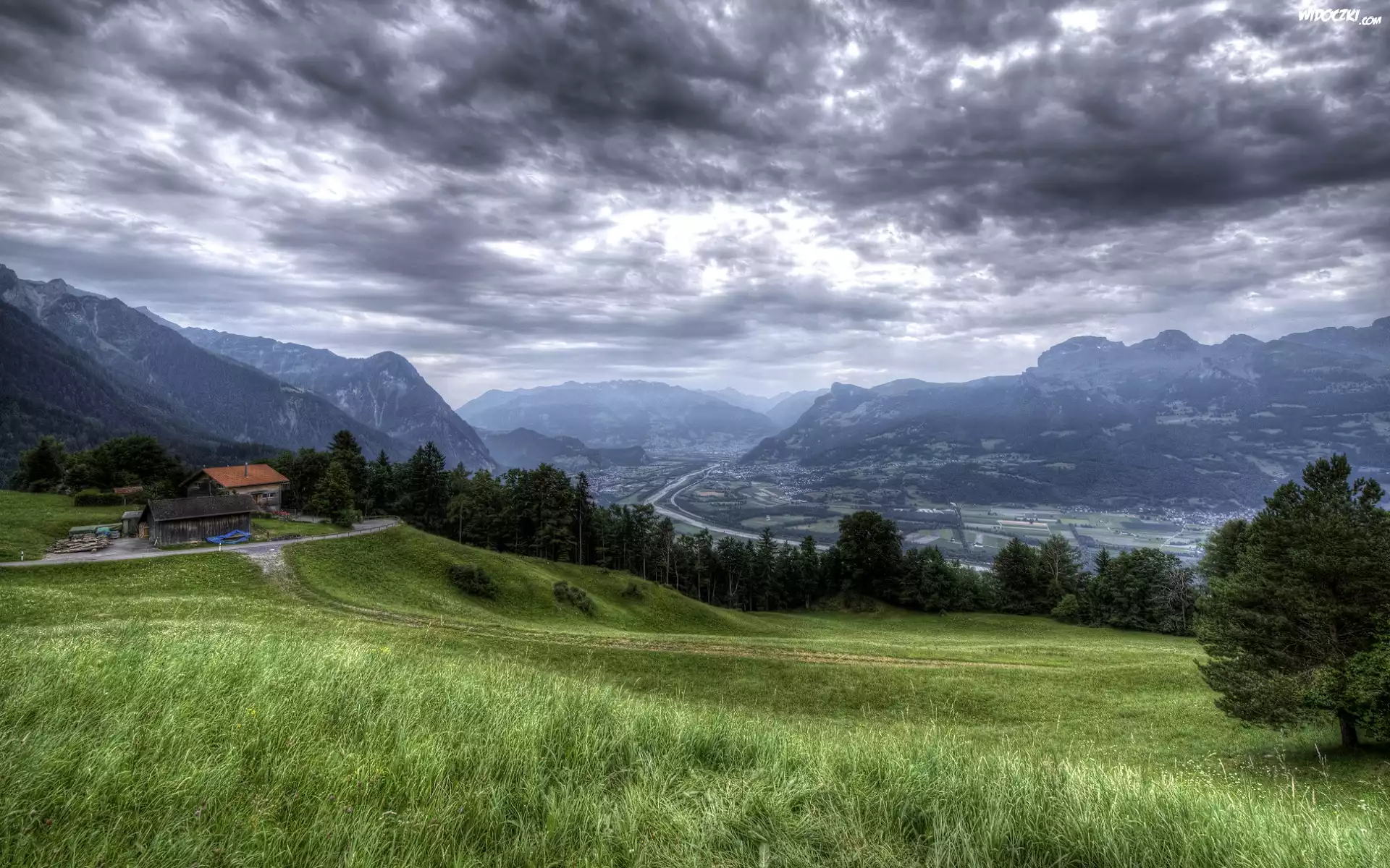 Dolina Renu, Granica, Liechtenstein, Gmina Triesen, Szwajcaria, Góry, Alpy, Rzeka Ren, Domy, Ciemne chmury, Lasy, Drzewa |