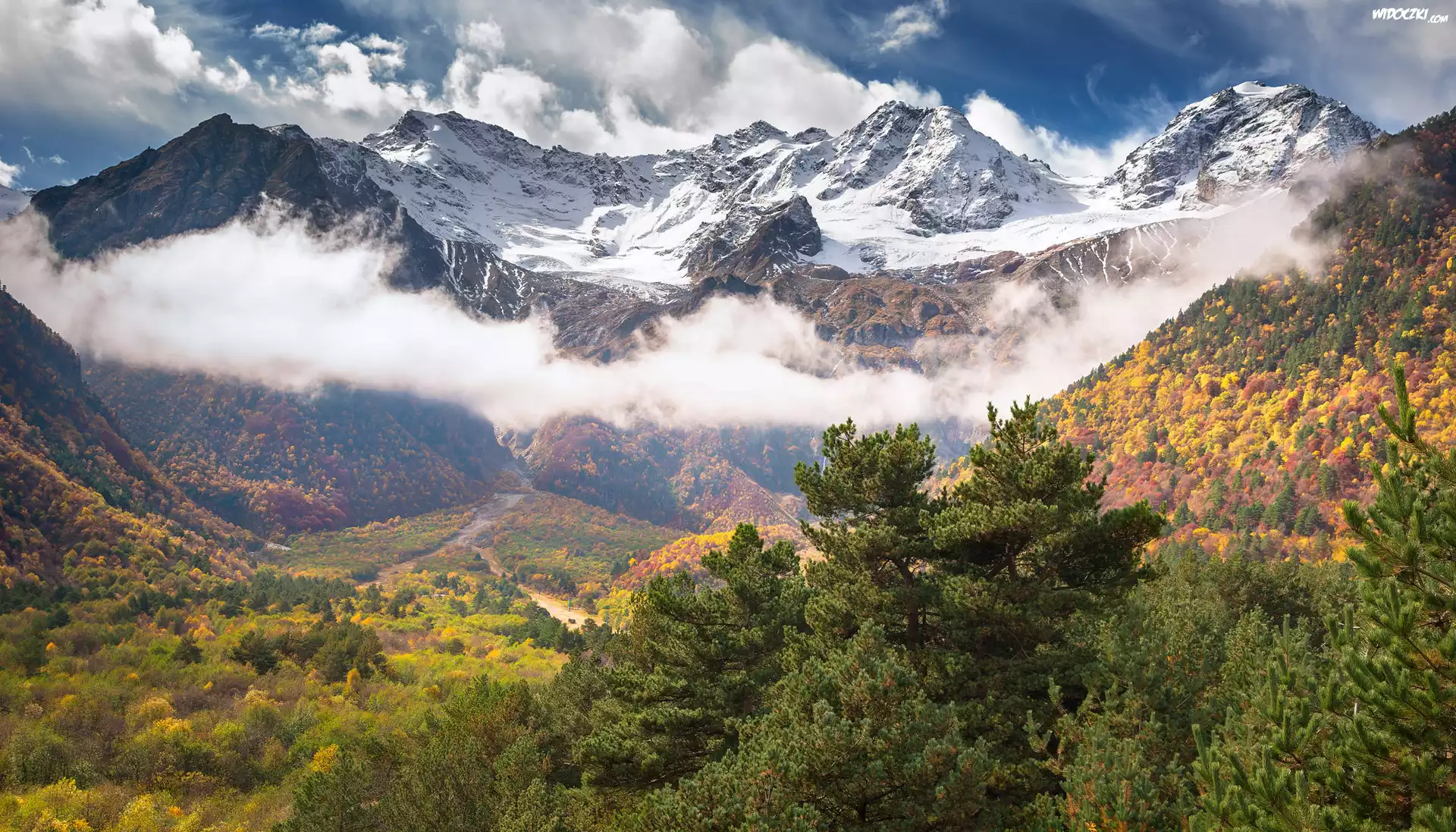 Zdjęcia, Jesień, Góry, Dolina, Wąwóz, Mgła, Drzewa, Droga, Kaukaz, Osetia Północna, Rosja
