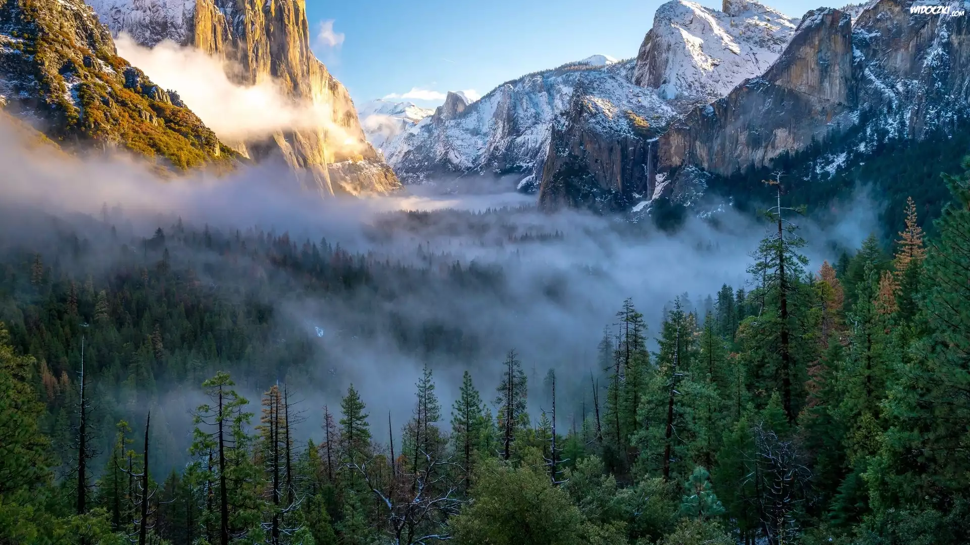 Dolina Yosemite Valley, Park Narodowy Yosemite, Lasy, Mgła, Góry, Stan Kalifornia, Stany Zjednoczone |