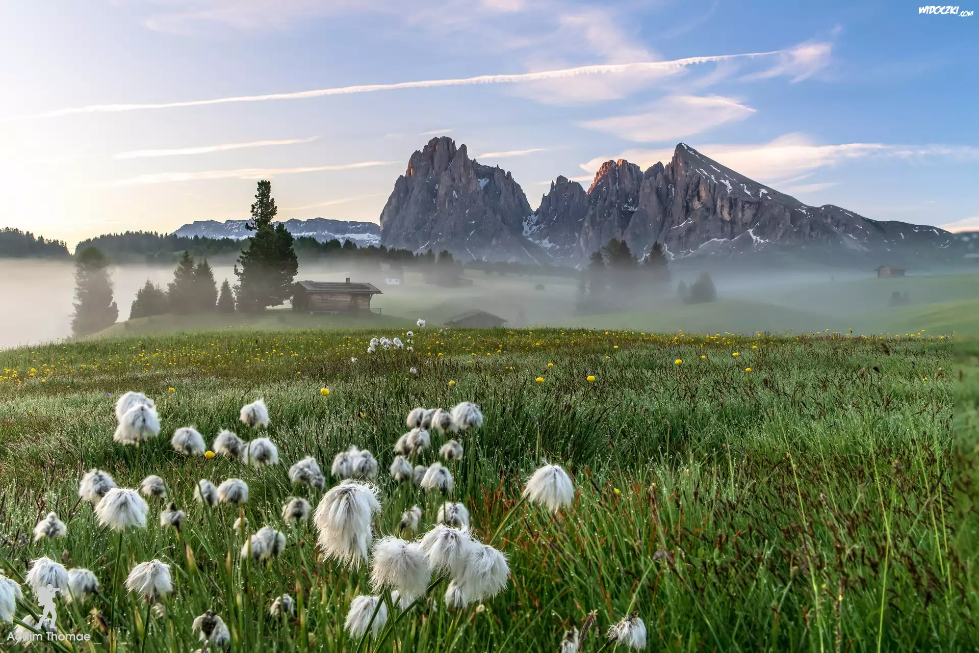 Łąka, Kwiaty, Domy, Mgła, Płaskowyż Seiser Alm, Dolina Val Gardena, Góry Sassolungo, Dolomity, Włochy |