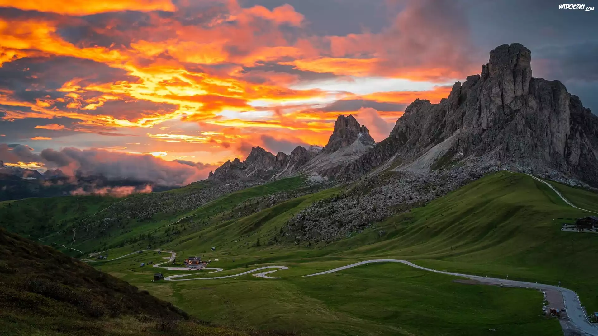 Dolomity, Przełęcz, Passo di Giau, Góry, Wzgórza, Kręta, Droga, Łąka, Zachód słońca, Prowincja Belluno, Włochy |