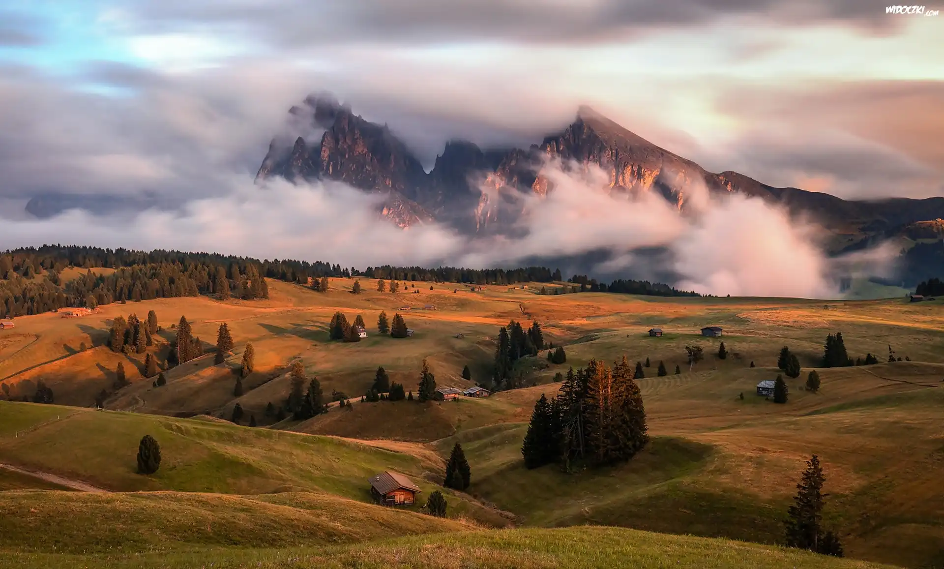 Włochy, Dolomity, Góry Alpy, Mgła, Dolina, Lasy, Domy
