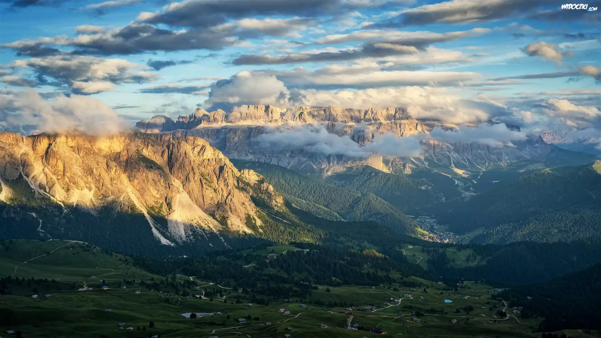 Zdjęcia, Szczyt, Seceda, Góry, Dolomity, Dolina, Chmury, Włochy