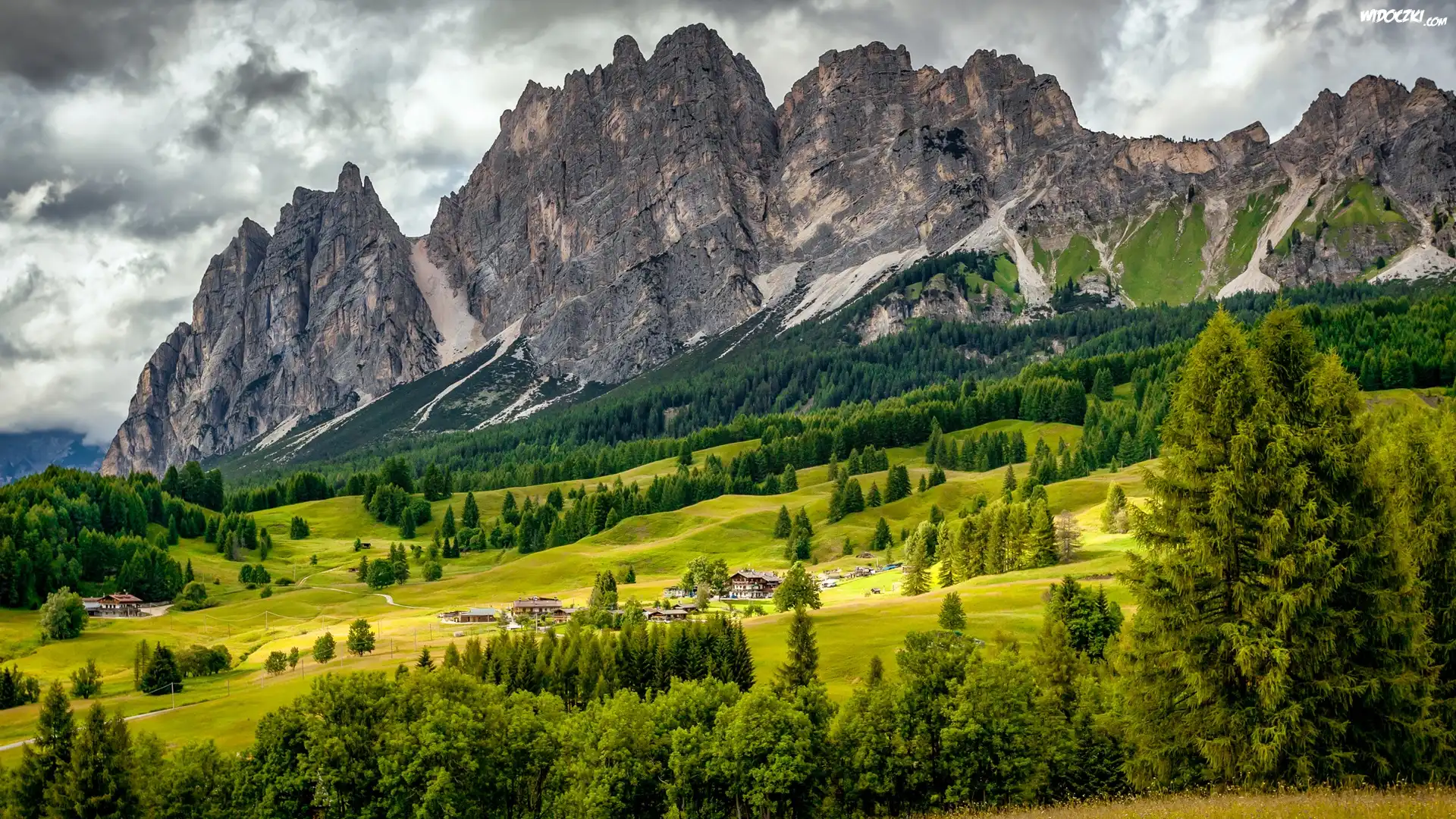 Zdjęcia, Góry, Dolomity, Las, Drzewa, Domy, Chmury, Włochy