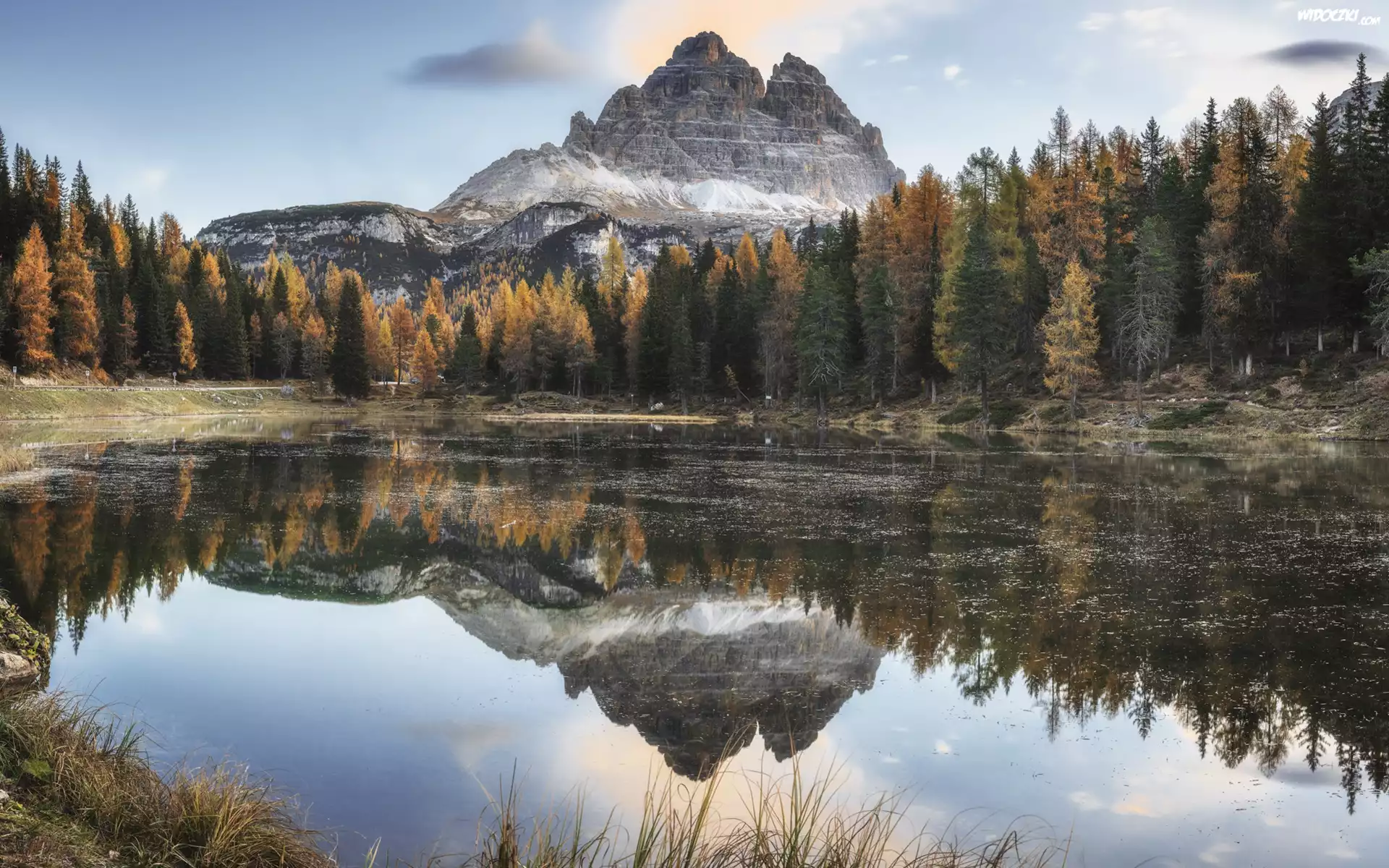 Jezioro, Antorno Lake, Góry, Dolomity, Masyw, Tre Cime di Lavaredo, Drzewa, Prowincja Belluno, Włochy |