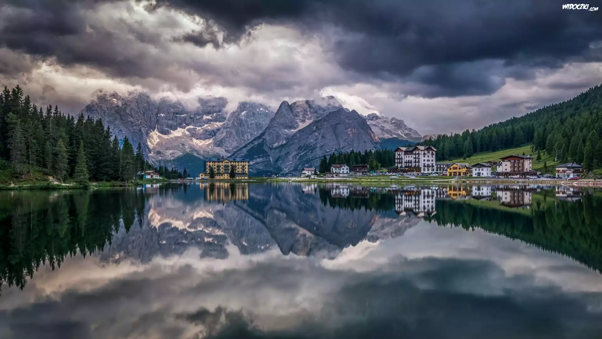 Miejscowość Cortina dAmpezzo, Góry Dolomity, Masyw Punta Sorapiss, Jezioro Misurina, Domy, Region Cadore, Włochy |