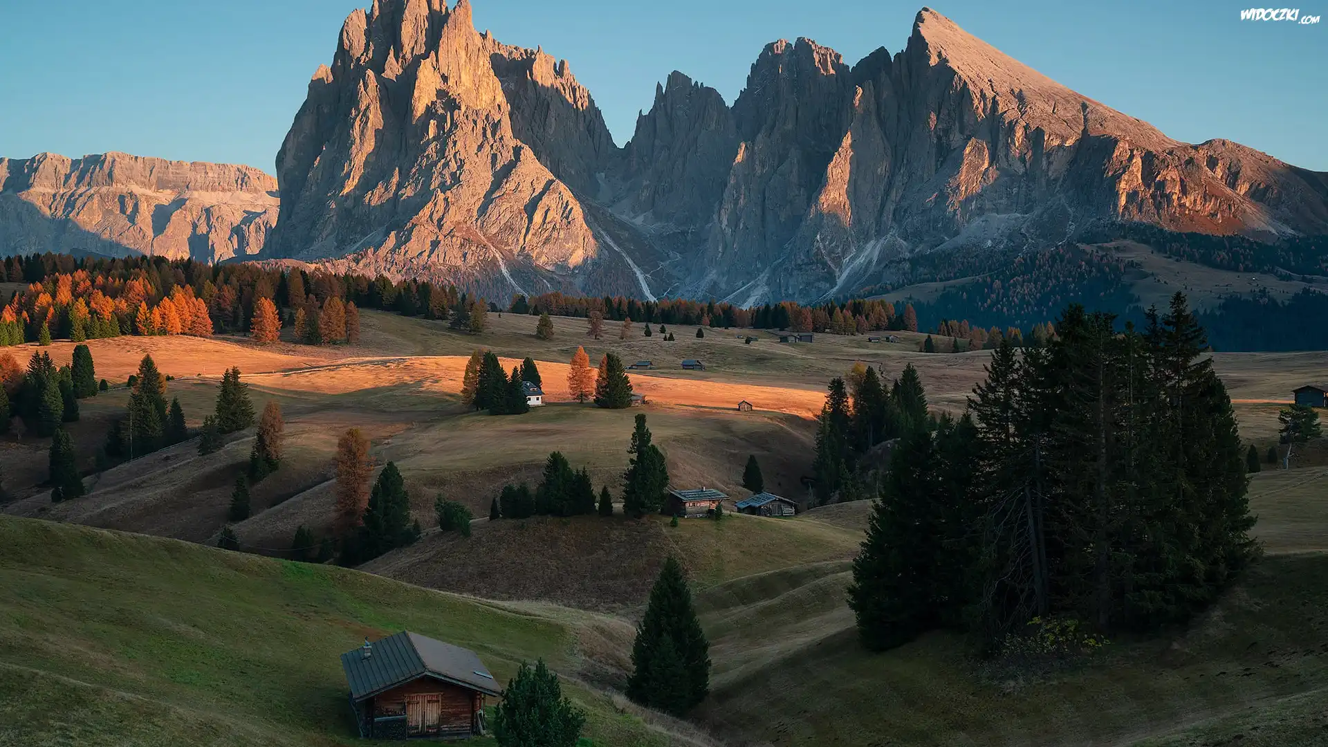 Dolomity, Góry, Sassolungo, Płaskowyż, Seiser Alm, Dolina, Val Gardena, Drzewa, Drewniane, Domy, Włochy |