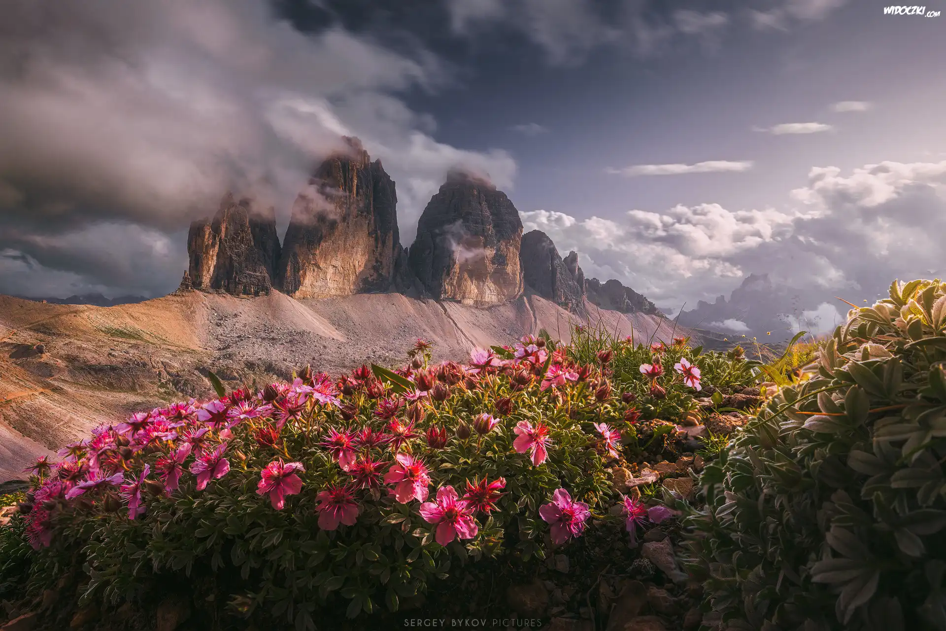 Zdjęcia, Góry, Skały, Tre Cime di Lavaredo, Dolomity, Polana, Kwiaty, Chmury, Włochy