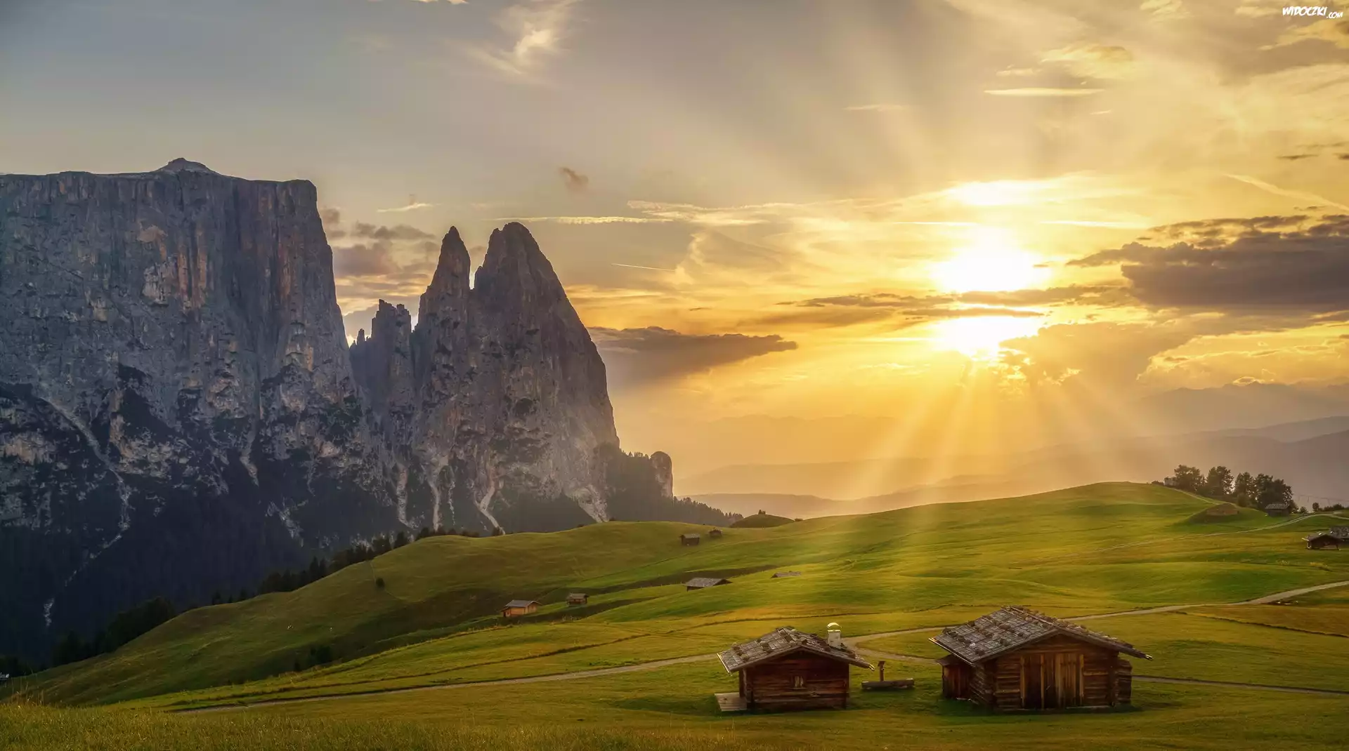 Zdjęcia, Włochy, Dolomity, Góra Schlern, Góry, Domy, Wschód słońca