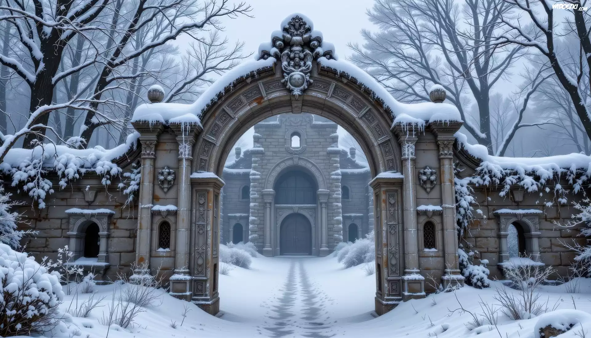 Zima, Brama, Mur, Dom, Drzewa, AI