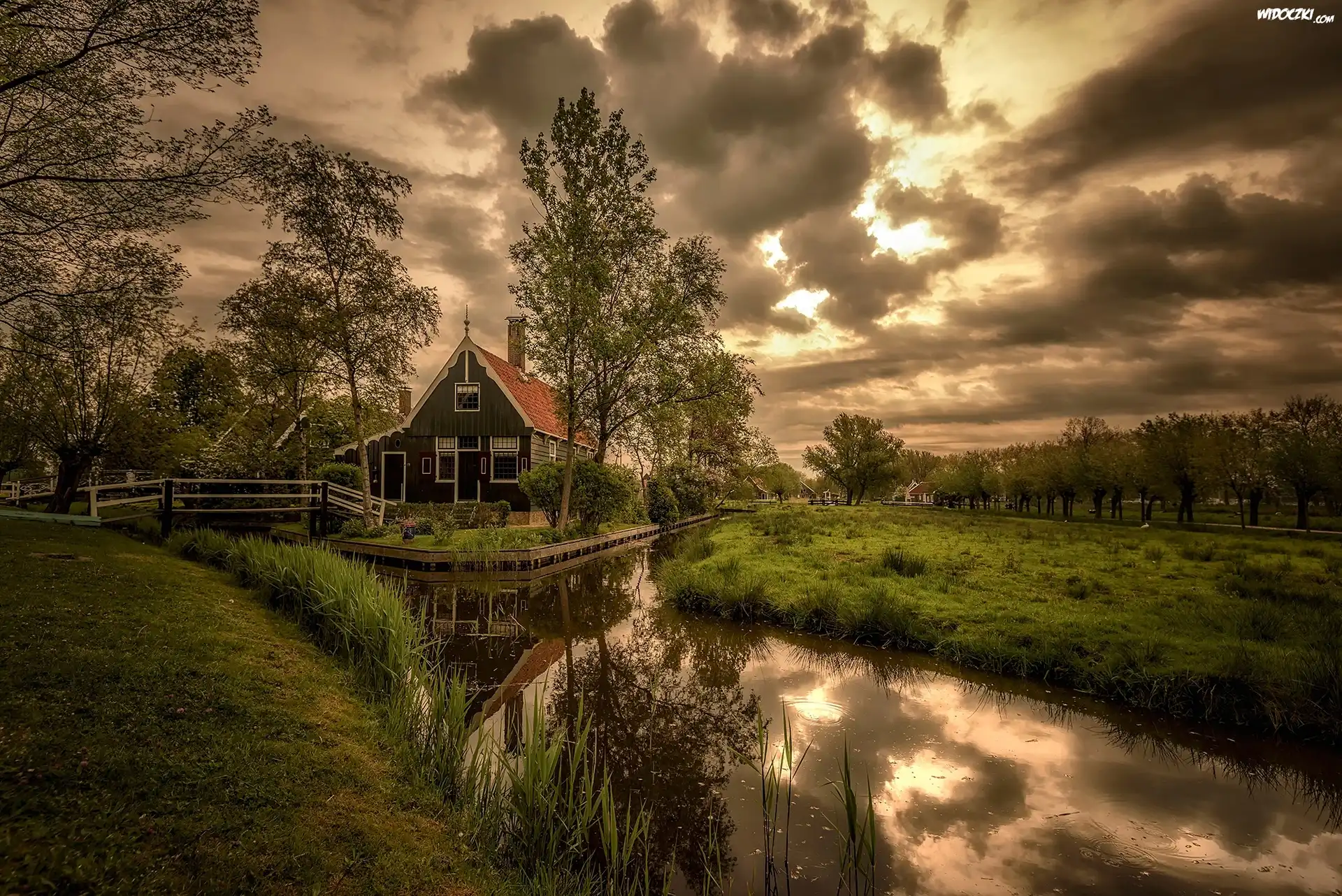 Zdjęcia, Dom, Strumyk, Łąki, Chmury