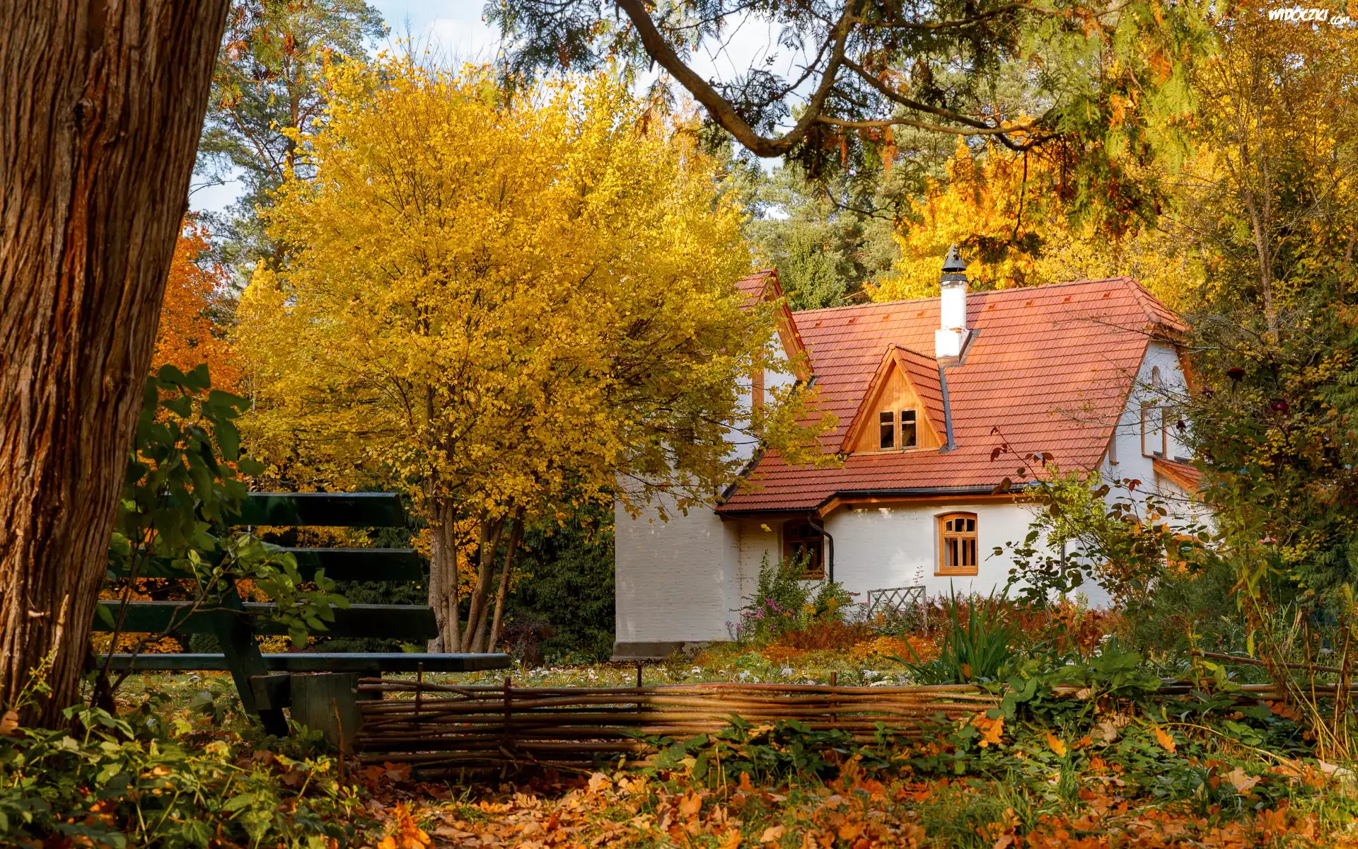 Zdjęcia, Biały, Dom, Czerwona, Dachówka, Drzewa, Ławka, Jesień