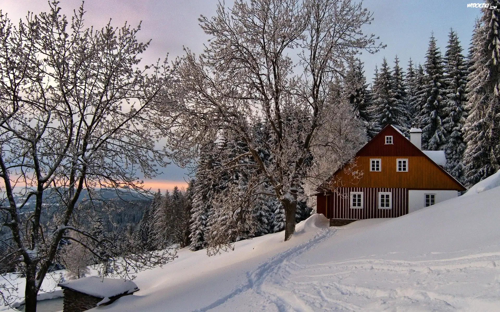 Zdjęcia, Dom, Góry, Lasy, Ścieżka, Zima