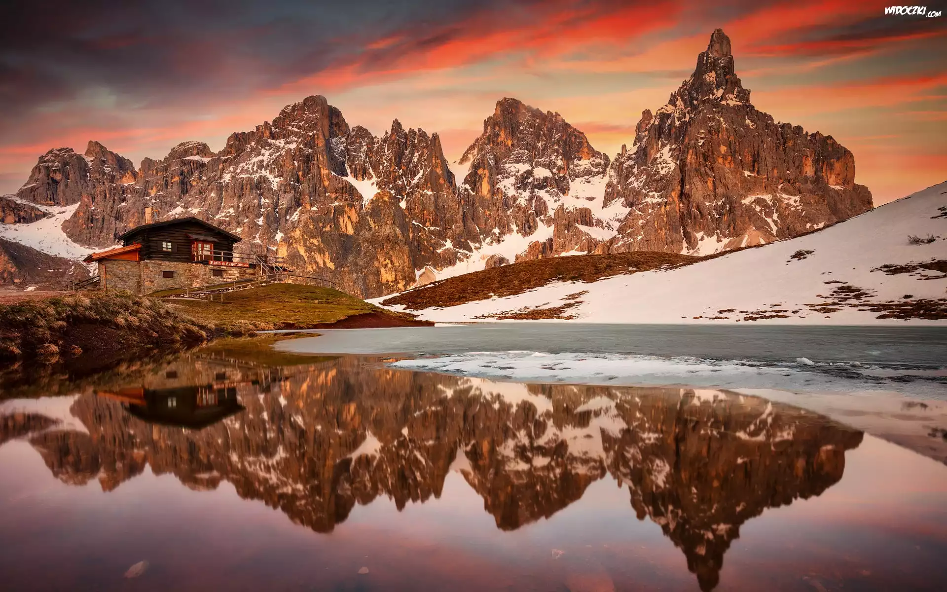 Włochy, Góry, Dolomity, Szczyt, Cimon della Pala, Jezioro, Dom, Schronisko Baita Segantini, Odbicie, Zima |
