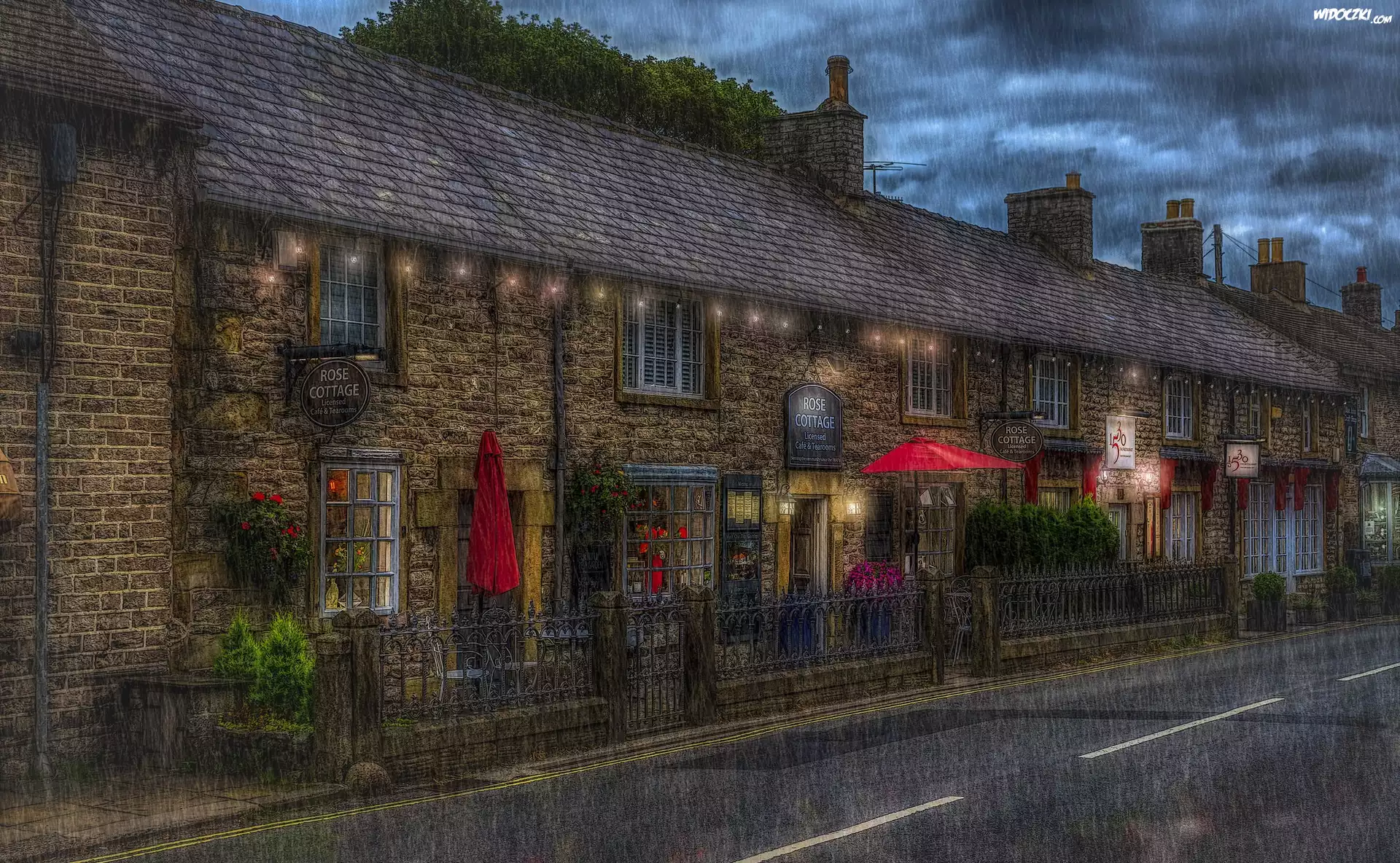 Zdjęcia, Dom, Kawiarenka, Stoliki, Ogrodzenie, Deszcz, Ulica