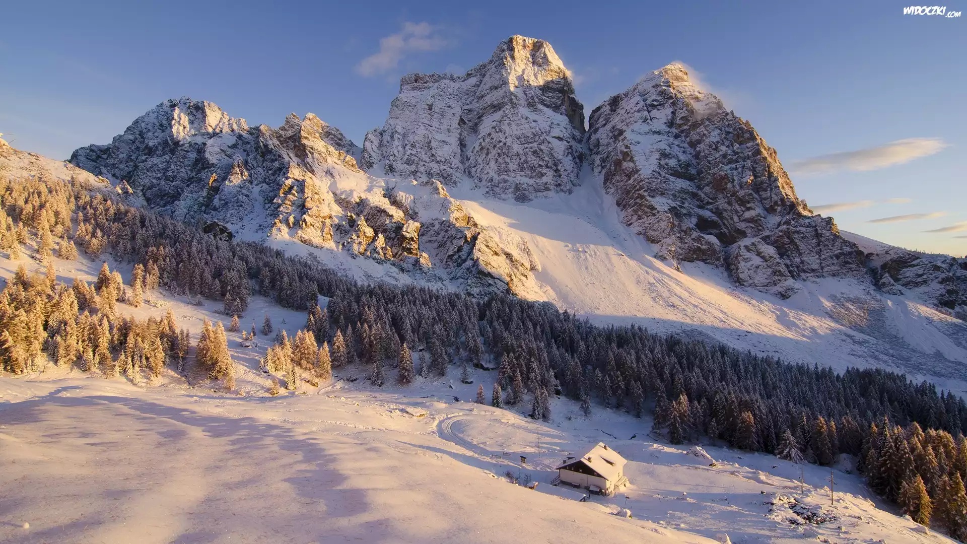 Zdjęcia, Włochy, Góry Dolomity, Szczyt Monte Pelmo, Zima, Las, Dom