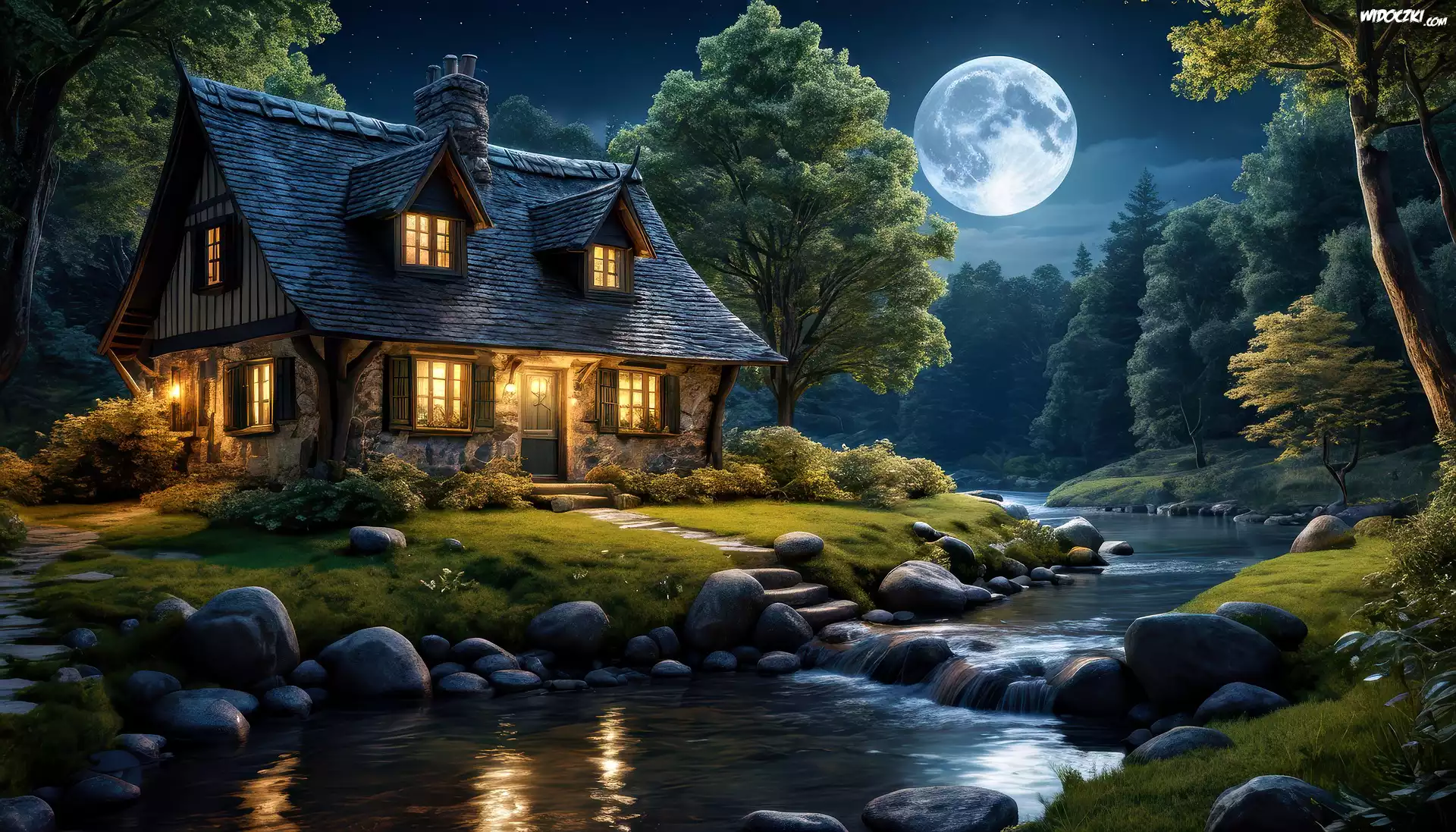 Zdjęcia, Rzeka, Dom, Drzewa, Księżyc, Grafika
