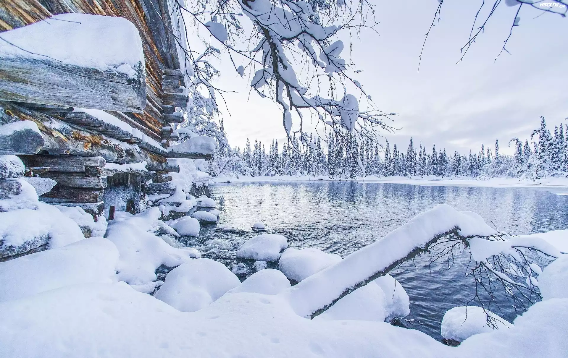 Zdjęcia, Śnieg, Drzewa, Dom, Jezioro