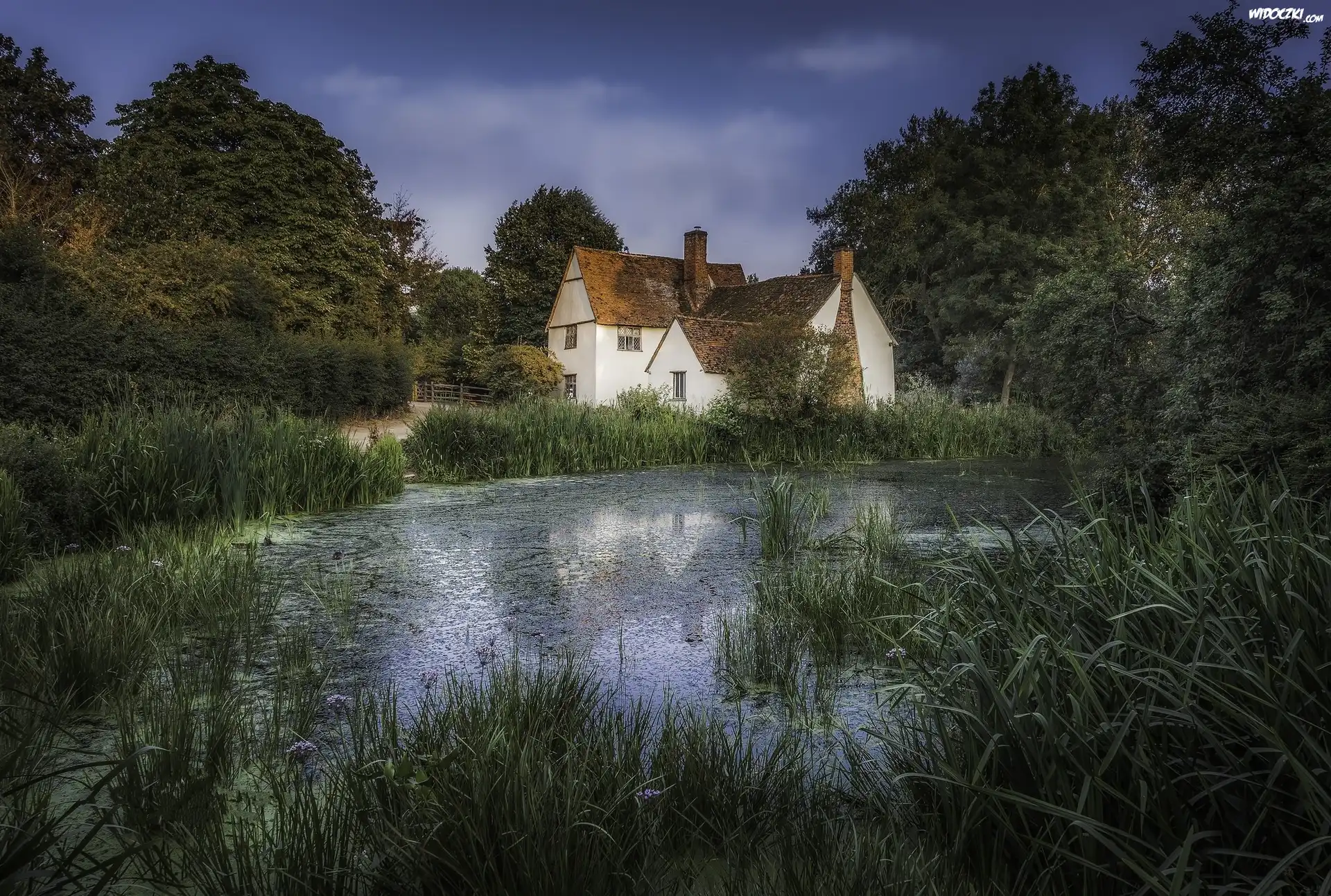 Zdjęcia, Dom, Trzciny, Trawy, Drzewa, Staw